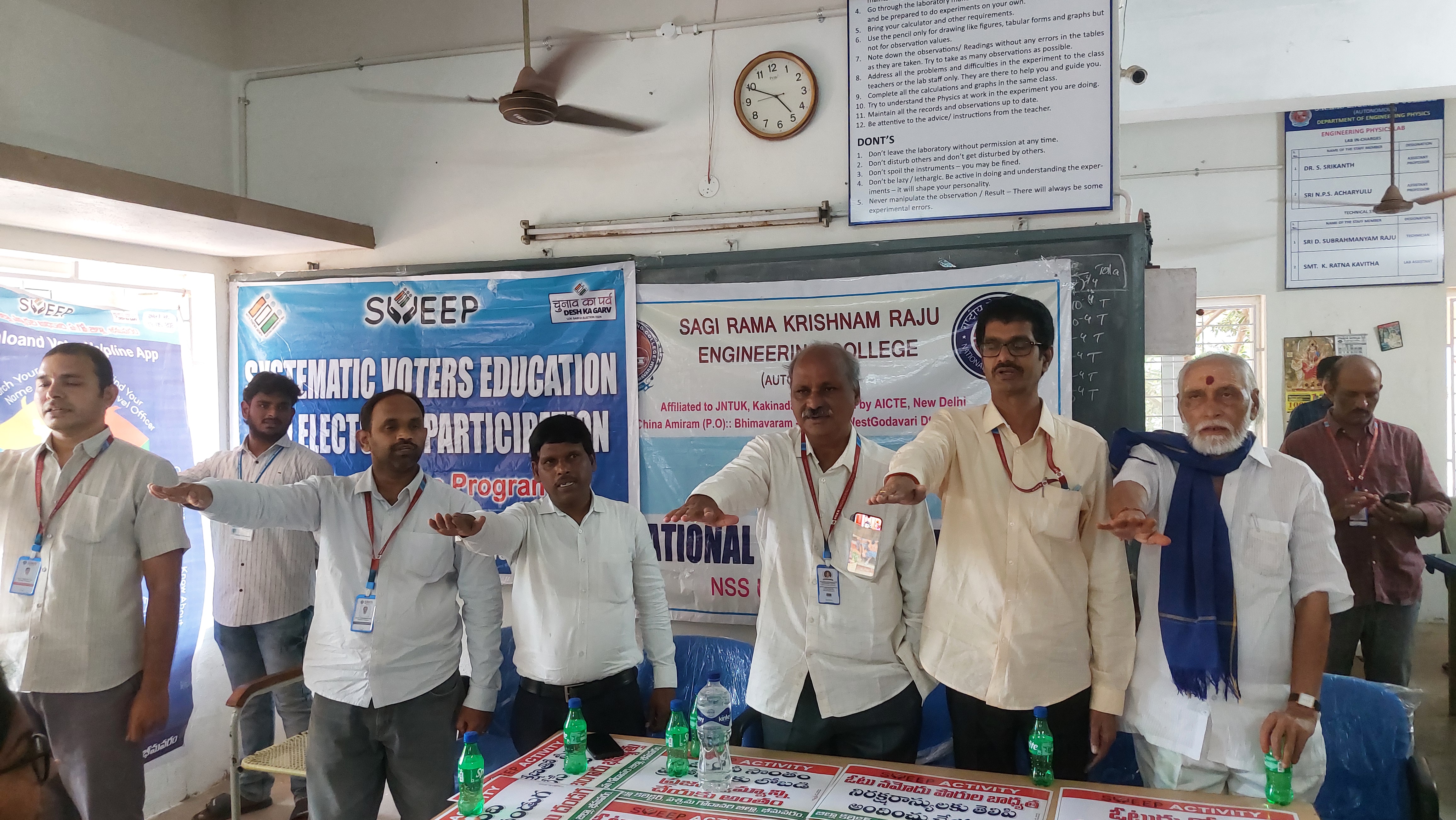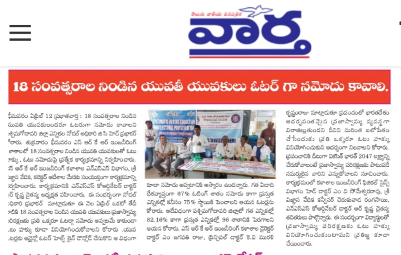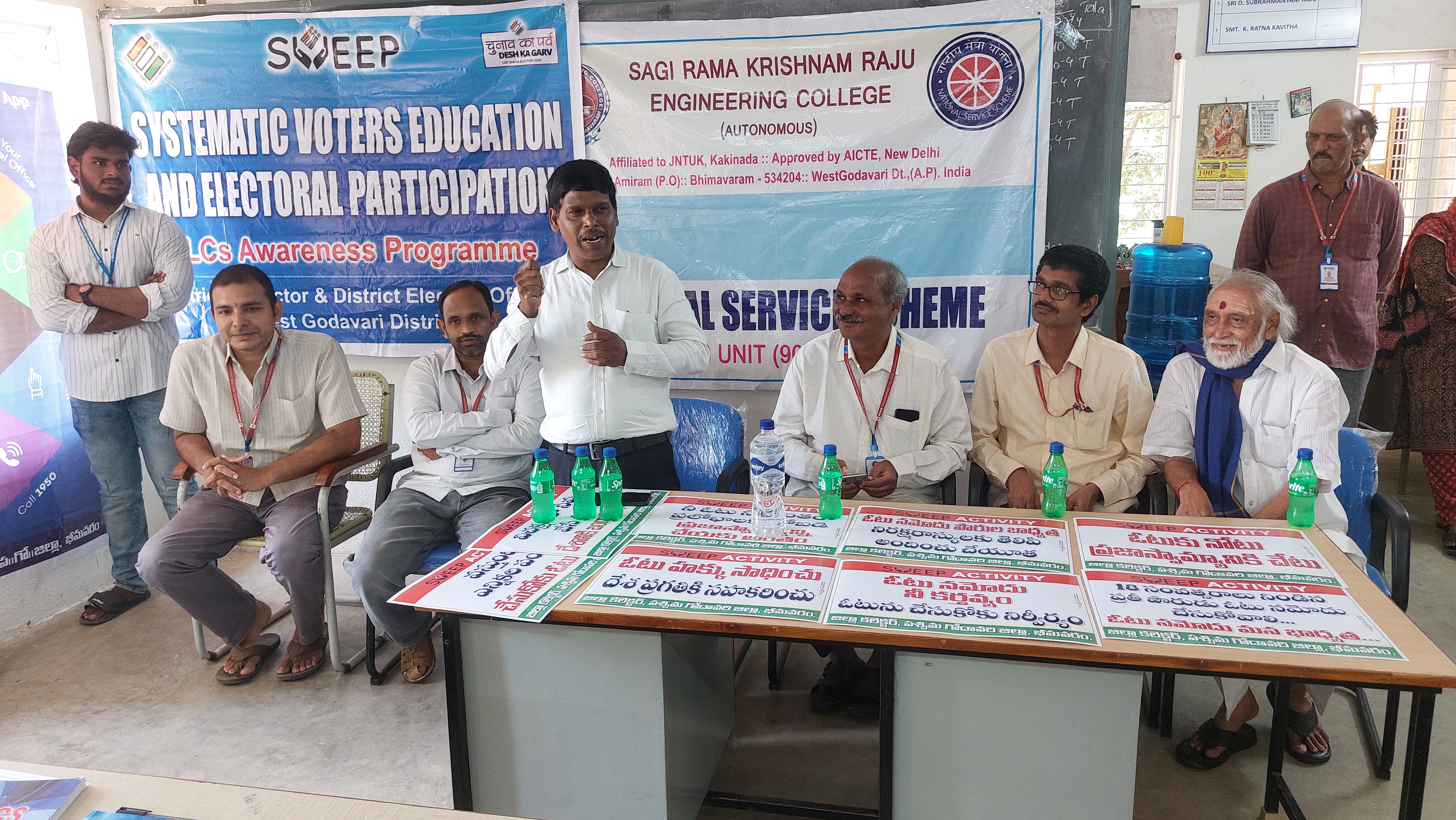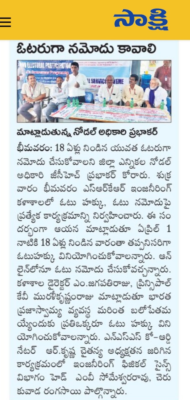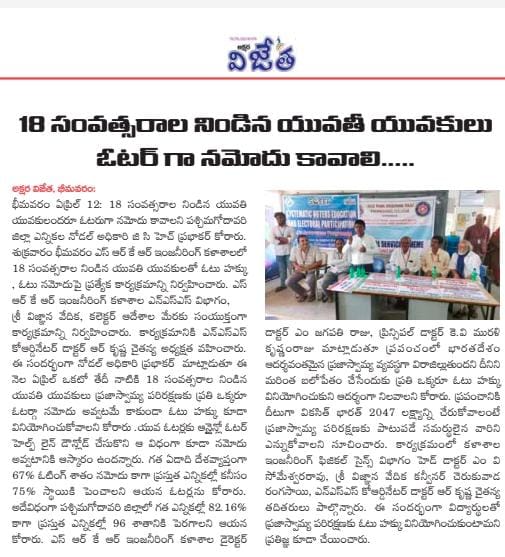 Bhimavaram, April 12: District Nodal Officer GCH Prabhakar garu has emphasized the importance of youth registering as voters. Addressing young women and men at SRKER Engineering College, Prabhakar garu highlighted the significance of exercising the right to vote for the protection of democracy. He urged those who turned 18 by April 1st to register and participate actively. NSS Coordinator Dr. R Krishnachai Tanya garu presided over the event, attended by College Director Dr. M Jagapathi Raju garu and Principal Dr. KV Muralikrishnam Raju garu. Prabhakar garu also encouraged downloading the voter helpline for easy registration.