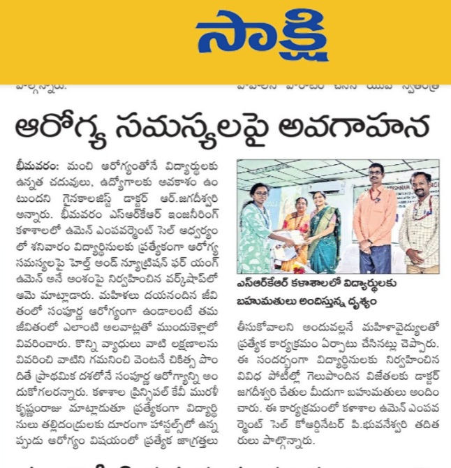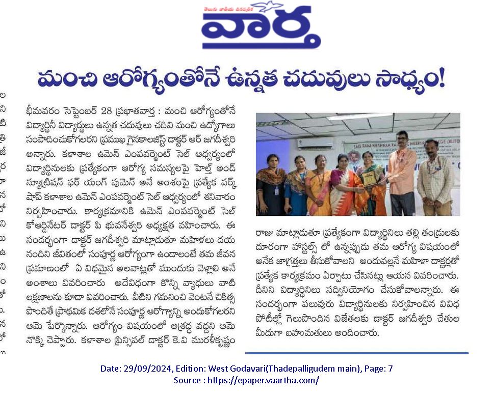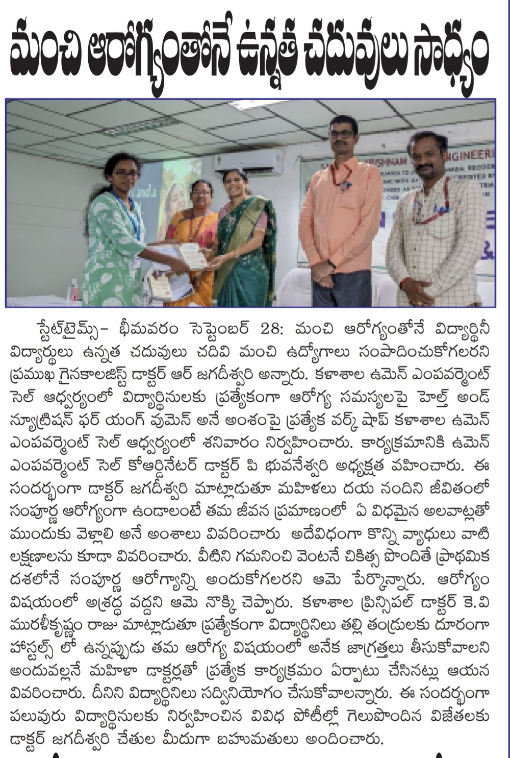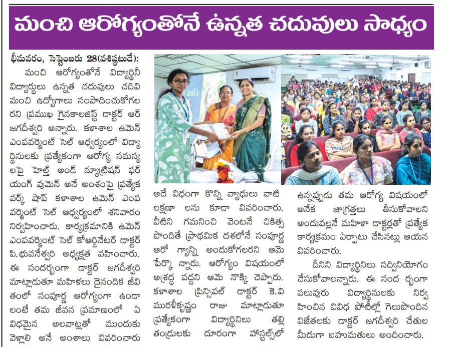 Bhimavaram, September 28 – A special workshop focused on the health and empowerment of female students was organized by the Empowerment Cell at [College Name]. The event, held on Saturday, aimed to promote awareness about the importance of maintaining good health, especially for young women living away from their families in hostels.