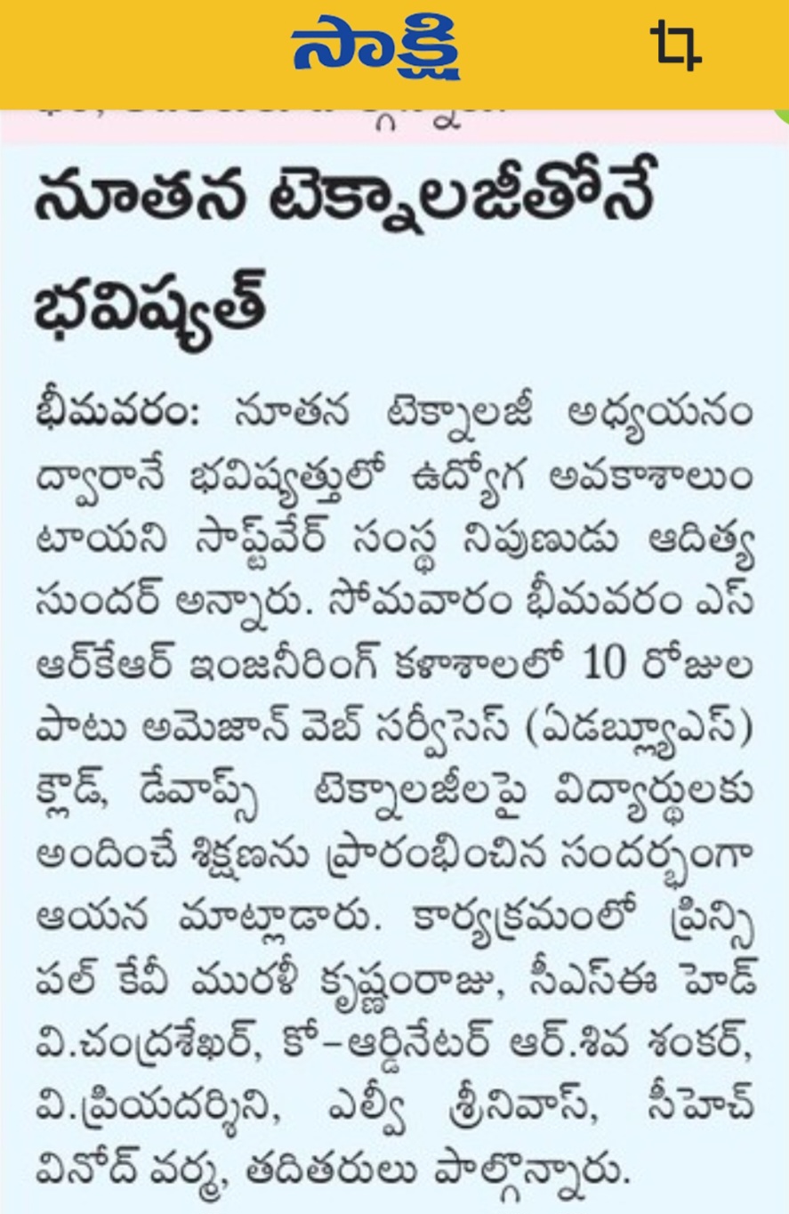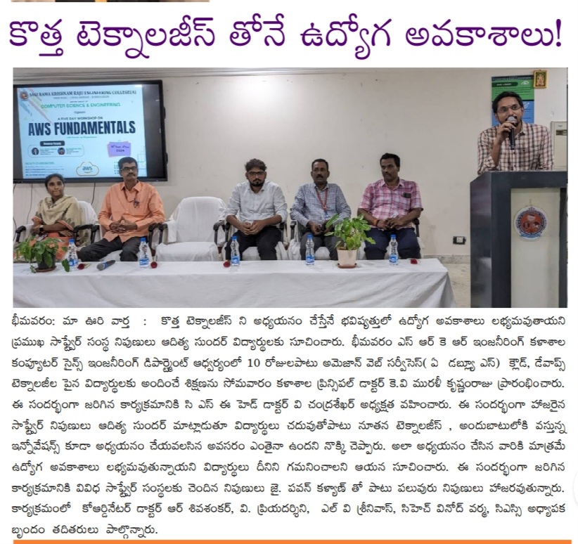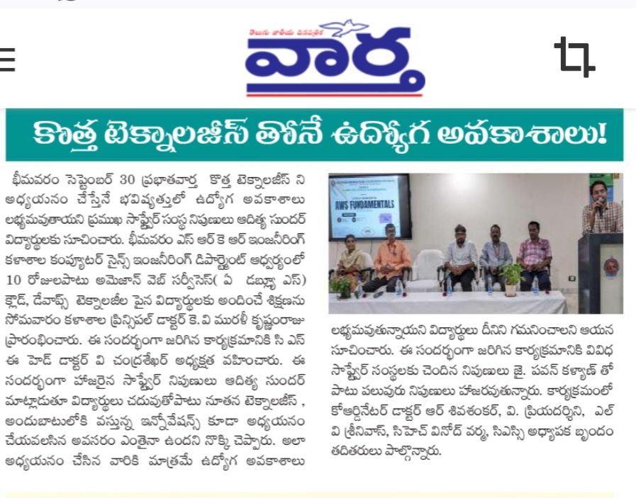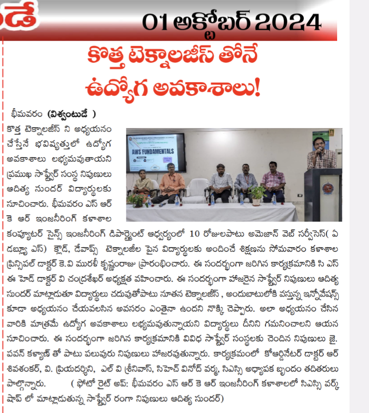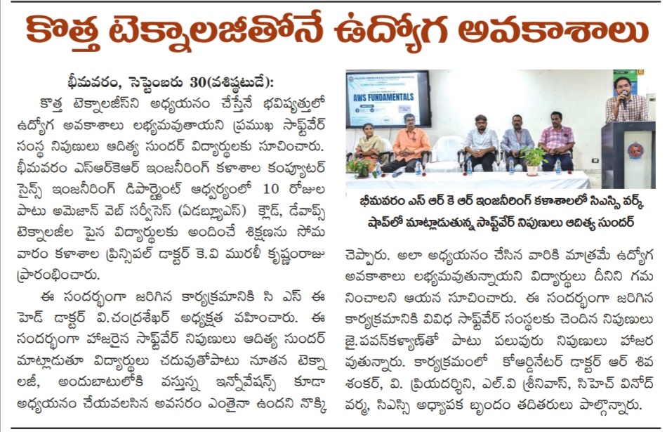 Bhimavaram, September 30 – In a significant step towards enhancing job opportunities for students, Bhimavaram SRK Engineering College has launched a 10-day training program focused on Amazon Web Services (AWS) Cloud and Daywaps technologies. The initiative, aimed at equipping students with knowledge of emerging technologies, was inaugurated by College Principal Dr. KV Murali Krishnamraju under the guidance of the Computer Science Engineering (CSE) Department.