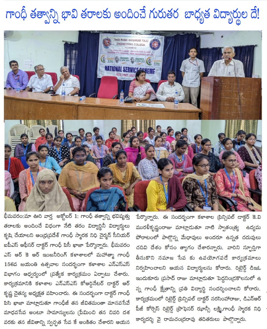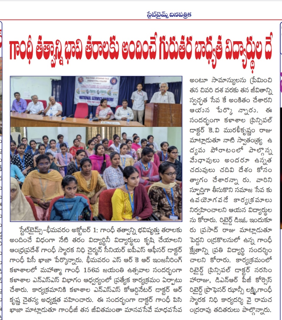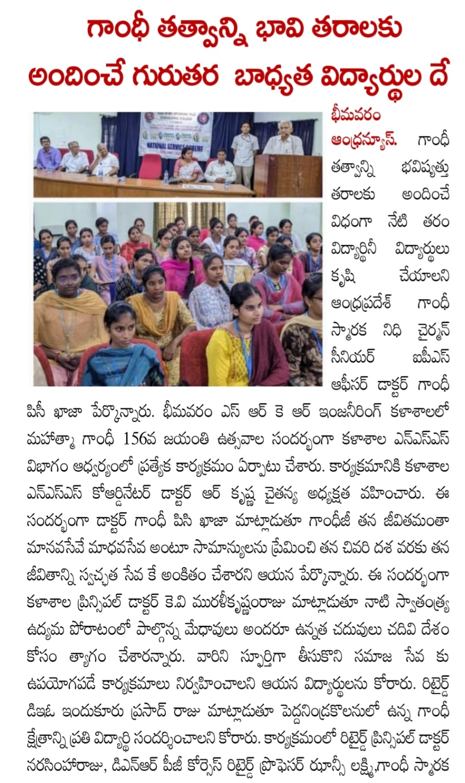 In honor of Mahatma Gandhi’s 156th birth anniversary, a special program was organized by the NSS department of SRK Engineering College. Dr. Gandhi PC Khaja, Chairman of the Andhra Pradesh Gandhi Memorial Fund and Senior IPS Officer, emphasized the responsibility of today’s students to preserve and impart Gandhi's philosophy to future generations.