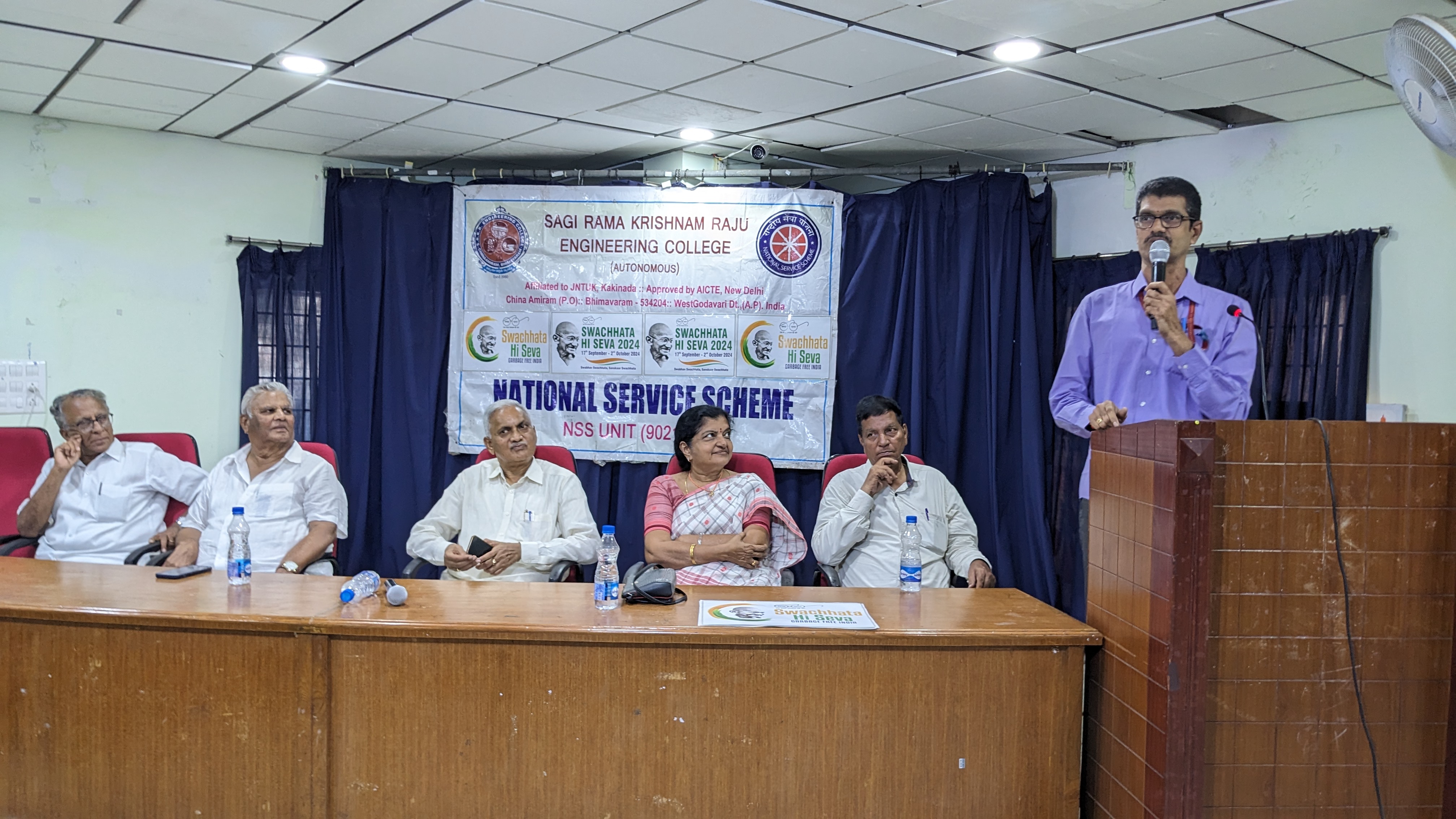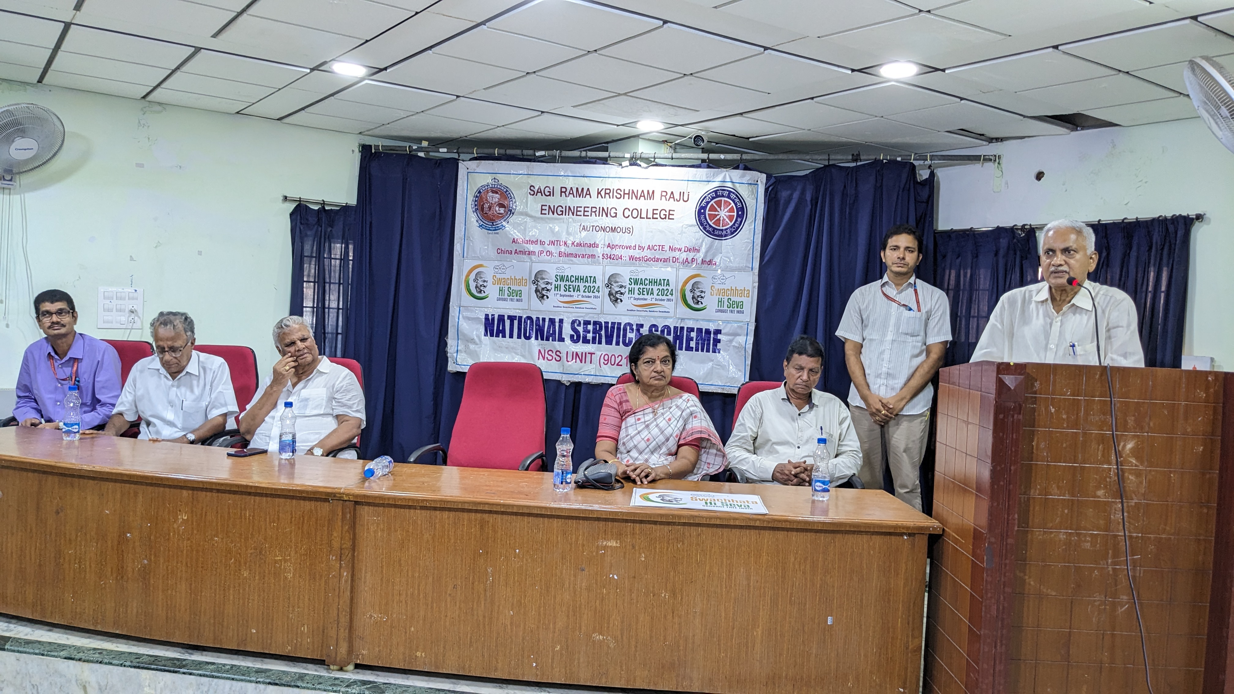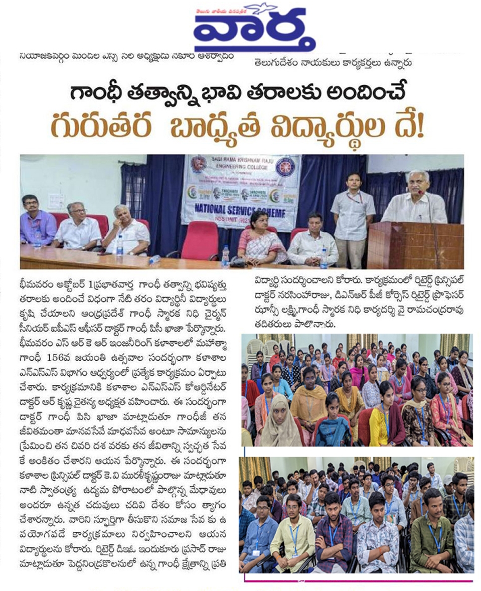 In honor of Mahatma Gandhi’s 156th birth anniversary, a special program was organized by the NSS department of SRK Engineering College. Dr. Gandhi PC Khaja, Chairman of the Andhra Pradesh Gandhi Memorial Fund and Senior IPS Officer, emphasized the responsibility of today’s students to preserve and impart Gandhi's philosophy to future generations.