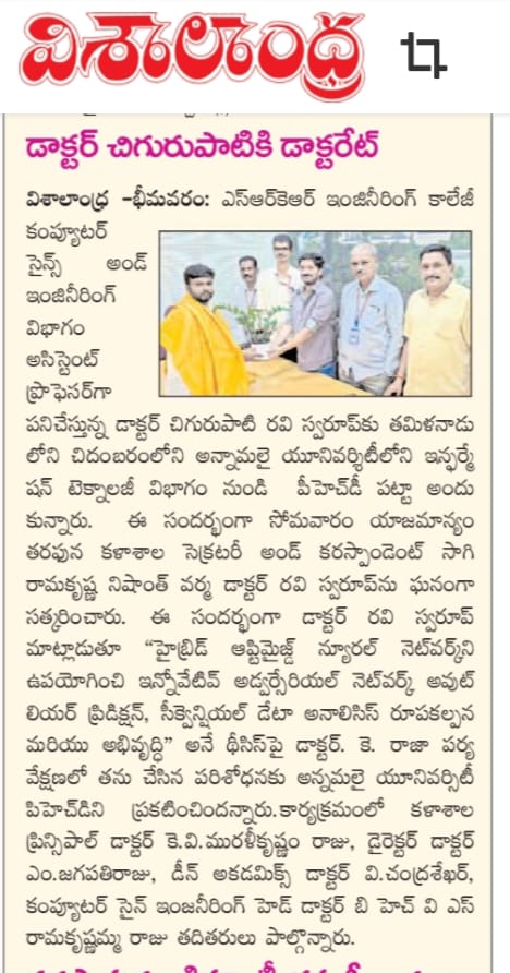 Bhimavaram, October 21 (Vashishtude): We are proud to announce that Dr. Chigurupathi Ravi Swaroop, Assistant Professor in the Department of Computer Science and Engineering at Bhimavaram SRK Engineering College, has been awarded his PhD degree from the Department of Information Technology at Annamalai University, Chidambaram, Tamil Nadu.