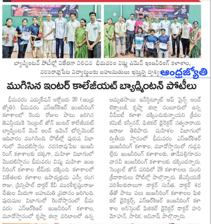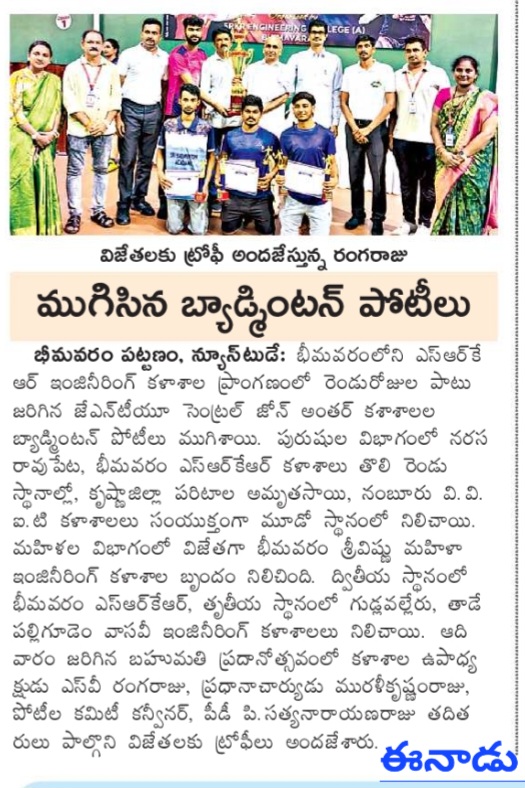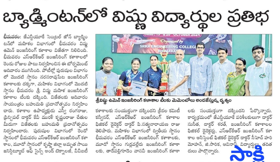 Bhimavaram: Bhimavaram Sri Vishnu Women's College of Engineering showcased exceptional talent by emerging as the winner in the women's category at the JNTUK Central Zone Badminton Tournament. The two-day event concluded at Bhimavaram SRKR Engineering College on Sunday.