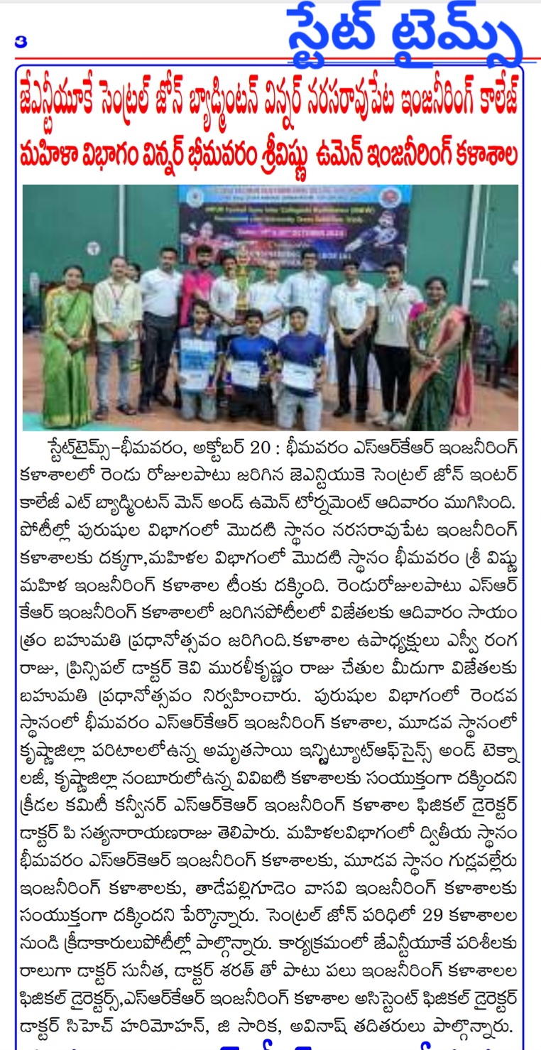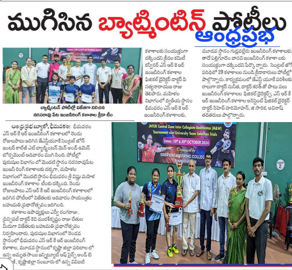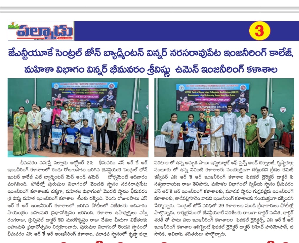 Dr. P. Satyanarayana Raju, Physical Director and Sports Committee Convenor at SRKR Engineering College, acknowledged the collaborative efforts that made the tournament successful. The third position in the women’s category was jointly awarded to Gudlavalleru Engineering College and Tadepalligudem Vasavi Engineering College.