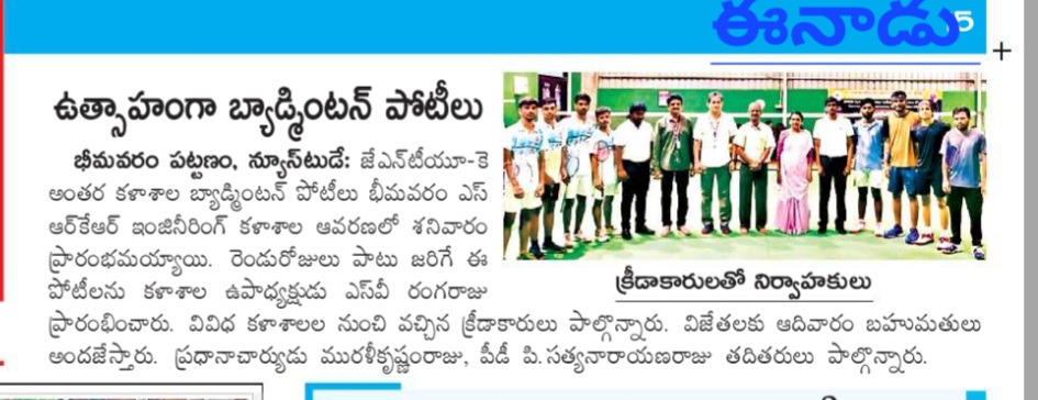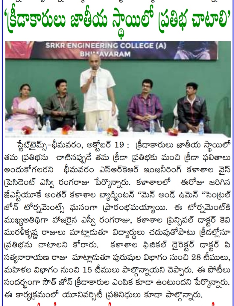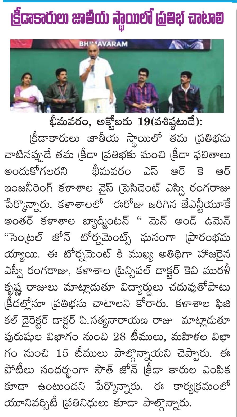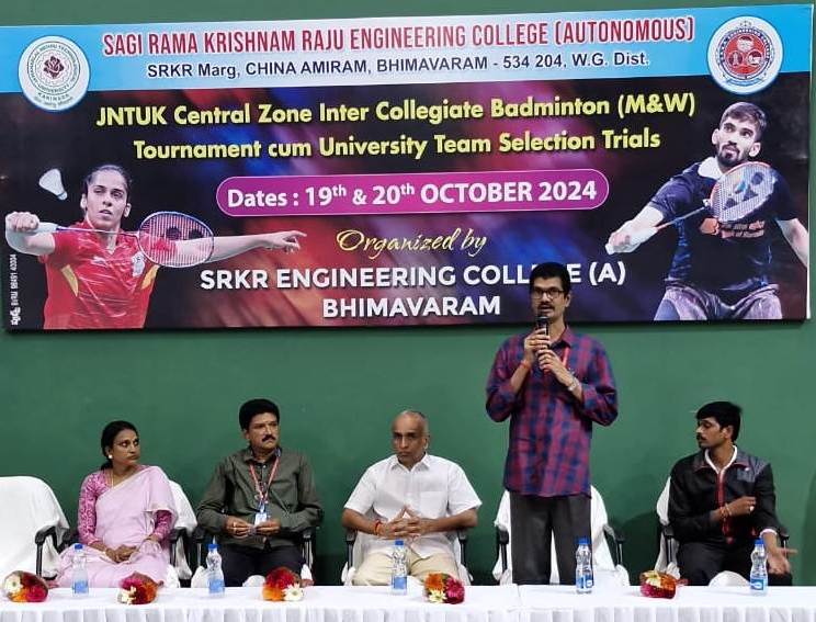 Bhimavaram, October 19: SRKR Engineering College Vice President SV Ranga Raju emphasized the importance of showcasing sports talent at the national level during the inauguration of the JNTUK Inter College Badminton Tournaments for men and women. The event kicked off with great enthusiasm, highlighting the college's commitment to promoting sports alongside academics.