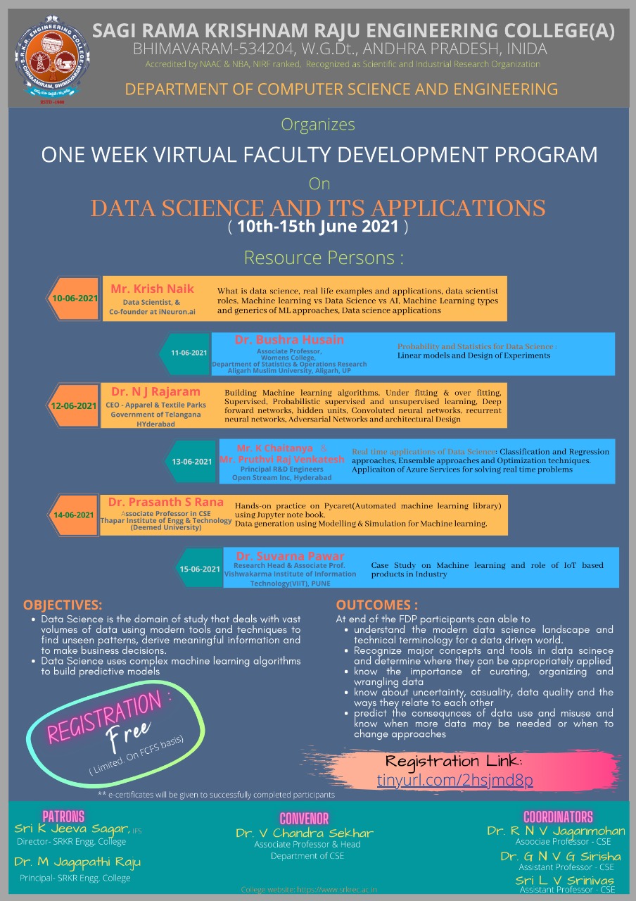 Department of Computer Science and Engineering that has completed 30 years of its existence is organizing one-week virtual FDP on "Data Science and its Applications" during 10th June to 15th June 2021.