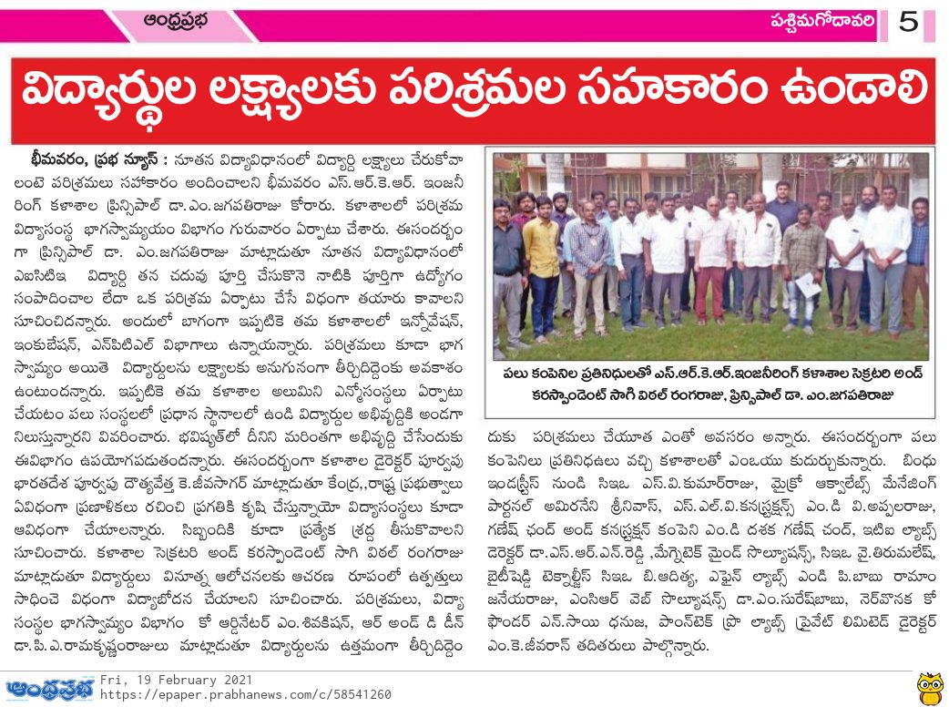 13 companies across all Departments have come forward to sign MoU's with SRKR Engineering college to help students get practical training and exposure to industry. The Management has interacted with the representatives of the Industry and noted the expectations from the students graduating out of SRKREC. The Principal and Heads of the Department have explained what the college could offer to Industry through the partnership.