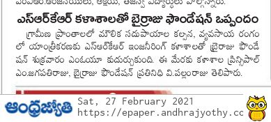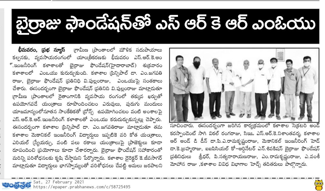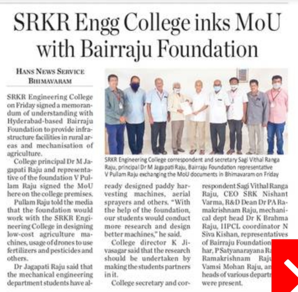 SRKREC has signed an Memorandum of Understanding with Hyderabad based Byrraju Foundation to provide infrastructural facilities to rural areas and mechanisation of agriculture. College principal Dr. M. Jagapathi Raju and representative of the foundation V Pullamraju signed the MOU here on the college premises.