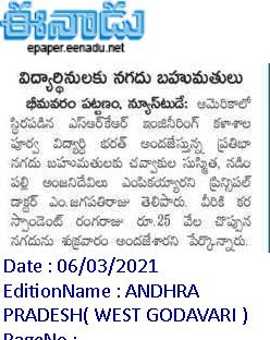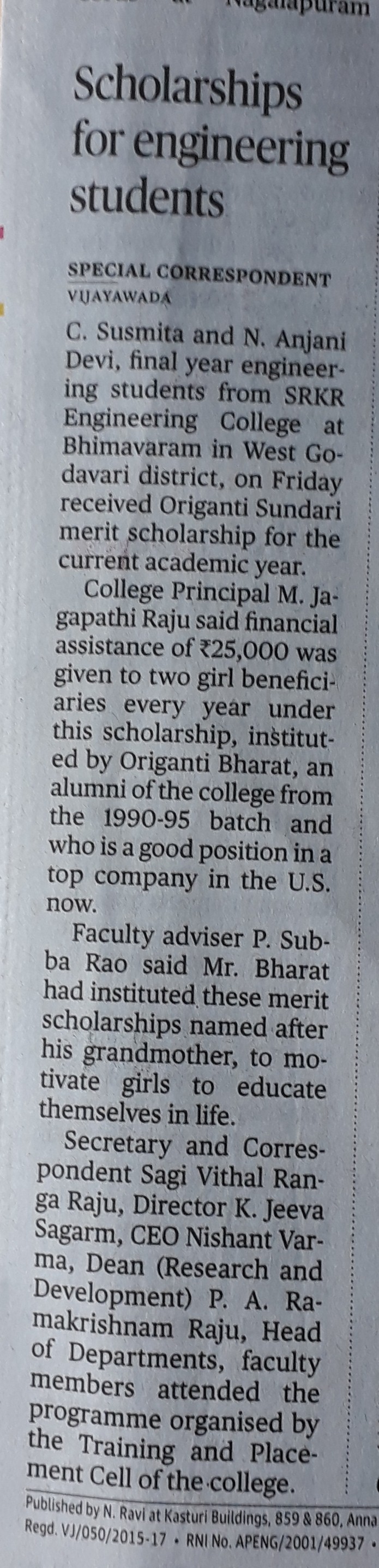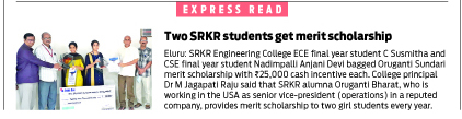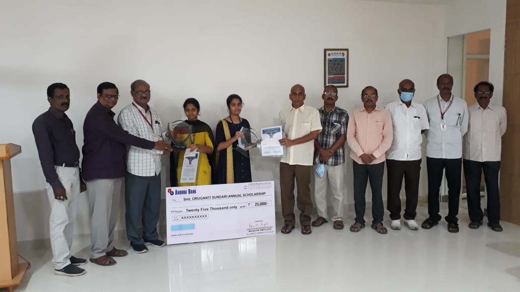 Smt Oruganti Sundari annual scholarship award sponsored by Mr Oruganti Bharat (1995 ECE Alumnus), Senior Vice President of operations at Q2 Inc. USA) has been presented to 2 best students of SRKREC. CHAVAKULA SUSMITHA (9.29 CGPA) from 4/4 ECE department and NADIMPALLI ANJANI DEVI (9.29 CGPA) of 4/4 CSE has been adjudged as winners of this award. A cash award of Rs.25,000/- has been presented to each of them.