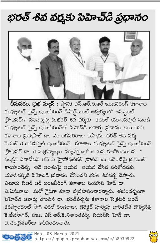 P Bharat Siva Varma, Assistant Professor of CSE Department, SRKREC has been awarded with PhD from KL University for his thesis titled "Functional Annotation of A Hypothetical Protein to Identify Druggable Components" under the guidance Dr. K. Subrahmanyam, KLU and Dr. Yesubabu, CRR Engineering College.