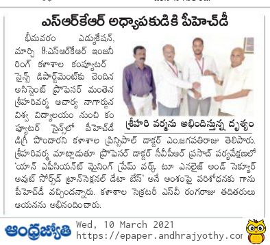 Mathena Sri Hari Varma, Assistant Professor of CSE Department, SRKREC has been awarded with PhD from Acharya Nagarjuna University for his thesis titled "Efficient Mining Framework to Analyse and Secure Outsourced Transactional Databases" under the guidance Dr. C V P R Prasad.