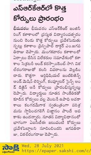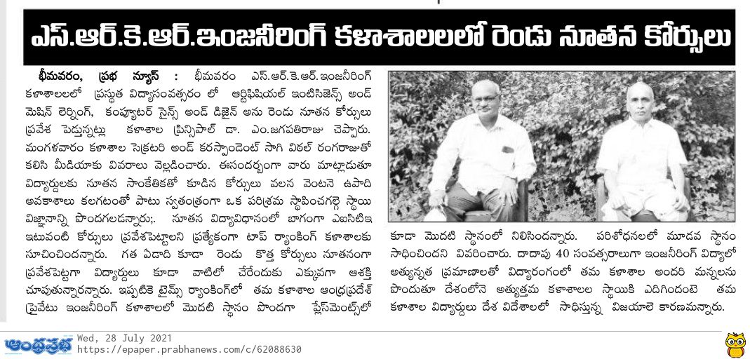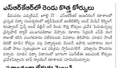 AICTE has sanctioned two new courses in SRKREC from the academic year 2021-22 along with the 2 additional branches sanctioned last year.