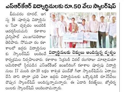 SRKREC alumni students introduced a special GiTA (Girls in Technology Advancement) scholarship with an inital fund of 10 lakh rupees. A group of 17 girl students who completed engineering in SRKREC from 1984 to 1987 batches has raised this fund in the memory of late beloved women faculty Gita Raj. As part of this scholarship, every year, two girl students - one from Civil Engineering and one from ECE branch would get scholarship worth Rs.25,000/-. For the year 2021, 2/4 Civil student Aregela Jyothirmayee and ECE student Ivvala Kiramnayee received the scholarships.