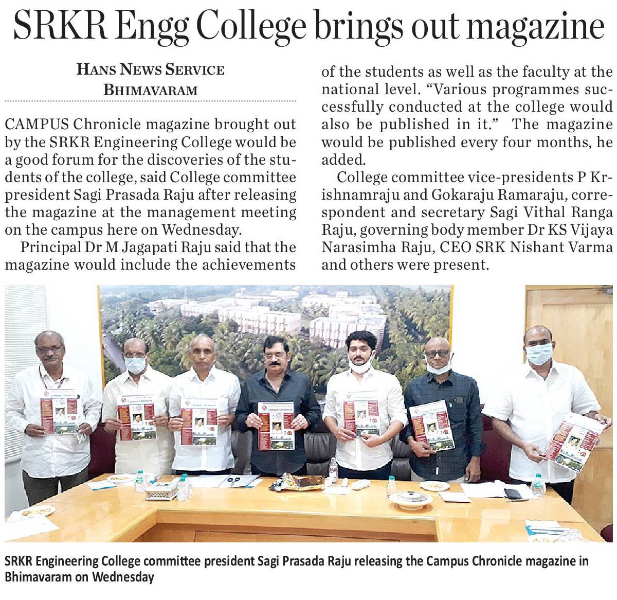The campus magazine of SRKREC named Campus Chronicle has been launched officially by the college management here on campus. The Campus Chronicle magazine will publish all the achievements, activities and happenings of the campus every 4 months. The college committee President Sri Sagi Prasada Raju garu, Vice Presidents Sri P Krishnam Raju garu, Sri Gokaraju Ramaraju garu, Secretary & Correspondent Sri S.V. Rangaraju garu, Governing Body Member Dr. K.S. Vijaya Narasimha Raju garu, CEO Sri S.R.K. Nishant garu, Principal Dr. Jagapathi Raju garu, and others were present on this occasion.