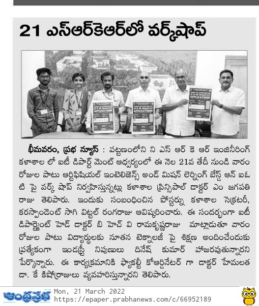 The Dept of Information Technology at SRKR Engg College was conducting a one week Workshop on 'Artificial Intelligence and Machine Learning Based on IOT' from 21st of March, 2022. The poster relating to the same was inaugurated by the Secretary and Correspondent of SRKR Engg College Sri. S. Vital Ranga Raju Garu.Speaking on this occasion the Principal of SRKR Engg College, Dr. M. Jagapathi Raju garu and HOD of IT Dept Dr. BHVS Ramakrishnam Raju garu had said that this programme was basically designed with the objective of disseminating the latest technologies to the students by the industry experts. Dr. K. Hemalatha and Dr. K. Kishore Raju will act as faculty coordinators for this workshop.