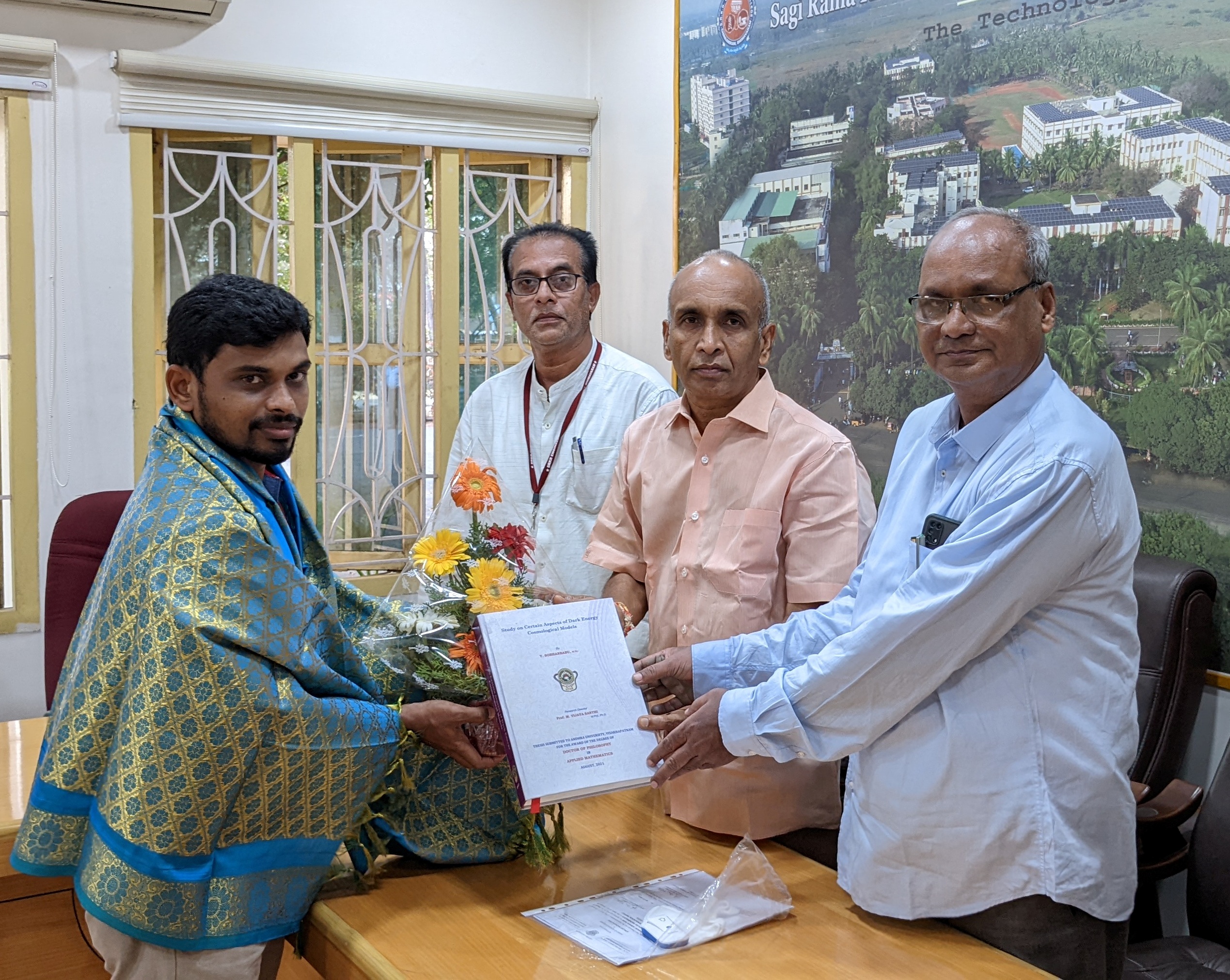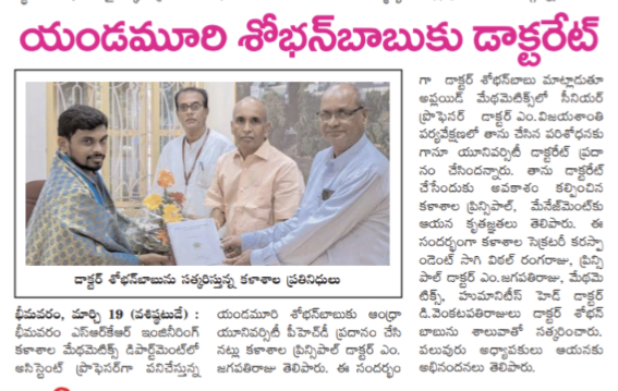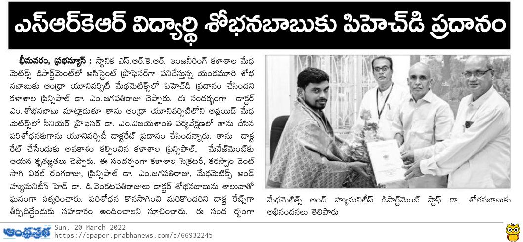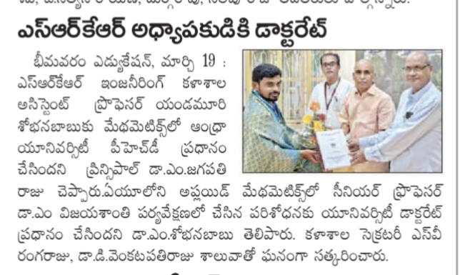 Yandamuri Sobhan Babu, Assistant Professor of Mathematics Department of SRKREC has been awarded with PhD in Applied Mathematics from Andhra University under the supervision of Dr. M. Vijaya Shanti, Senior Profesor, Andhra University Visakhapatnam.
