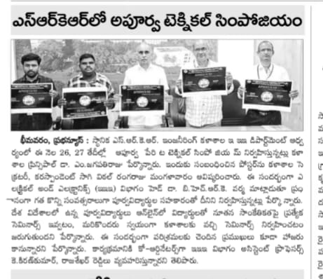 The Dept of EEE at SRKR Engg College is conducting a Technical Symposium named as 'APOORVA' on 26th & 27th of March, 2022. The poster relating to the same was inaugurated by the Secretary and Correspondent of SRKR Engg College Sri. S. Vital Ranga Raju garu. This Programme is being conducted with the collaboration and support of the alumni who are in the prominent positions in the industry. The alumni in various foreign countries would connect to the students in virtual mode and some of the alumni will visit the campus physically and interact with the students. Industry experts are also going to be a part of this symposium. Principal of SRKR Engg College Dr. M. Jagapathi Raju garu and Head of EEE Dept Dr. BHRK Varma urged the students to make use of this opportunity and enhance their knowledge. Mr. Kiran Kumar and Mr. Rajasekhar Reddy are acting as coordinators for this symposium.