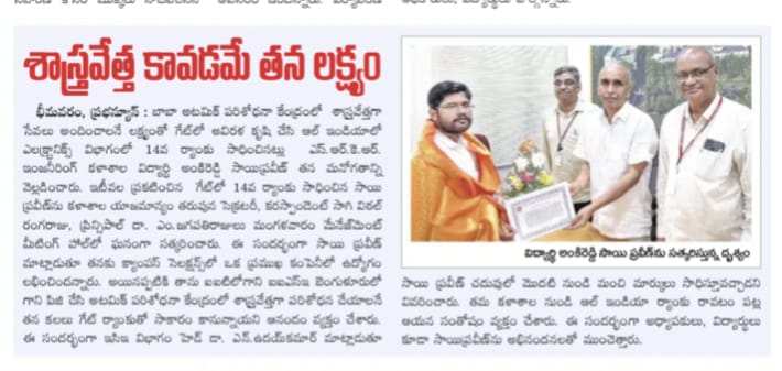 Mr. Ankireddy Sai Praveen, the student of SRKR Engg College had achieved 14th Rank in the GATE examination and got accolades to the institution. The Secretaty and Correspondent of SRKR Engg College Mr. S. Vital Ranga Raju garu and Principal of SRKR Engg College Dr. M. Jagapathi Raju garu felicitated Mr. Praveen and wished him all the best for his future endeavors. They suggested the students to get inspired from Mr. Praveen and dream high and achieve great results. Speaking on this occasion Mr. Praveen had said that though he got a very good job opportunity in campus placements, he had always dreamt of doing research in atomic sector. He aspires to become a scientist at Baba Atomic Research Center and do service to the country. HOD of ECE dept Dr. N. Uday Kumar and other faculty conveyed their warm wishes to Mr. Praveen on his achievement.