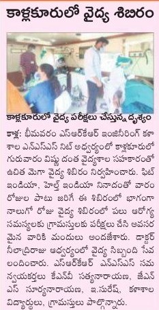 The students of NSS Unit at SRKR Engineering College had conducted a health camp at Kallakuru Village. The doctors from prominent hospitals had diagnosed the villagers for various health issues and had given free medicines. This programme was held with the backdrop of 'FIT INDIA-HEALTHY INDIA'. Dr. Neeladri Raju, college NSS Coordinators Mr. KNV Satyanarayana, Mr. JNS Suryanarayana, E. Suresh and the village administration along with the students of SRKR had rendered their services in this noble initiative.