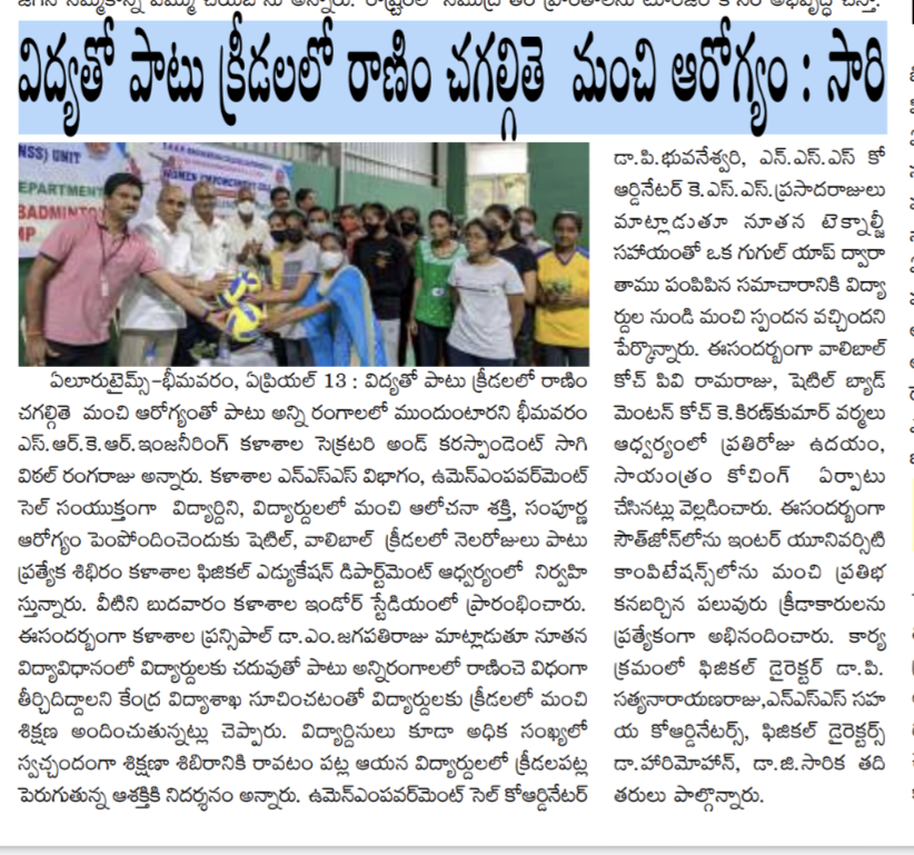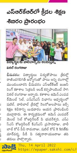 Principal of SRKR Engg College Dr. M. Jagapathi Raju garu had said that the Sports Day celebrations would be held at the college on 23rd April, 2022 at 5:30 PM for which Sri. Ravi prakash, Superintendent of Police of West Godavari Dist and ASP Sri. AV Subbaraju would be attending as the guests and give away the prizes to the students who had excelled in Sports. He invited all the students, parents, teaching and non teaching fraternity to attend all the programmes and make it a grand success.