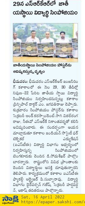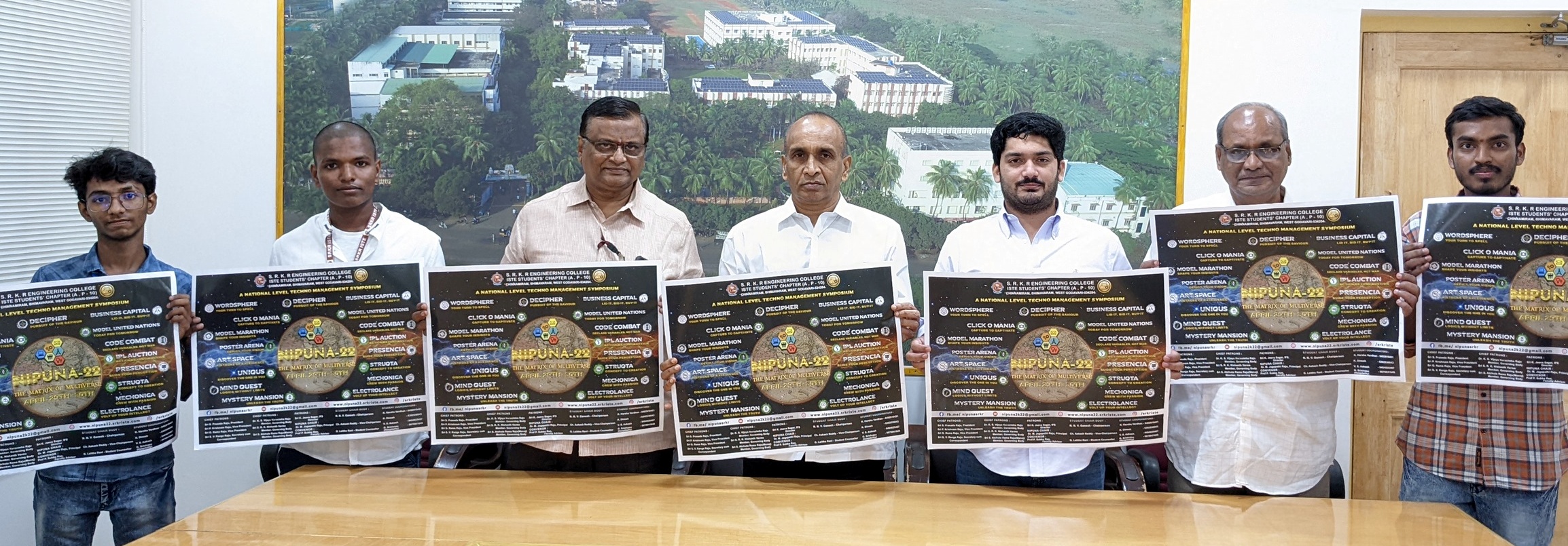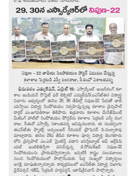 ISTE (Indian Society for Technical Education) student chapter is conducting two day national level student symposium NIPUNA-22 at SRKR Engineering College on 29 th and 30 th of this month. A poster of this event is being inaugurated at the college by CEO Sri. SRK Nishanth Varma Garu, Secretary & Correspondent Sri. SV Ranga Raju garu and Principal Dr. M. Jagapathi Raju garu. Speaking on this occasion ISTE Faculty Advisor and Senior Professor P. Subbarao has said that this event would be inaugurated on 29 th April by prominent alumni of the college, D. Somsekhar, Principal ML Scientist at Wadhwani Institute of AI, Bangalore. There was a huge response from student community around the state to participate in this event. ISTE Student Division Chairperson Ganesh, Secretary Harshavardhan, Akash Srinivas had participated in this programme.