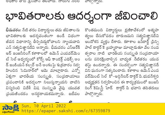 The Women Empowerment Cell at SRKR Engineering College had conducted a seminar on 'Codes of Conduct: Ethics and Indian Culture' on 8 th April, 2022. Prominent Advocate N. Satyavignana Devi has been the chief guest of this seminar. Speaking on this occasion she said that students of this generation should lead a life style which should be the role model for the upcoming generations. She emphasized that students should respect the Indian traditions and culture which are very prominent from the early ages and they should not get distracted towards the foreign culture which will create a negative impact. She said that students should control their emotions and committing suicides in the heat of the moment should be avoided. Incharge Principal of the College Dr. Brahma Raju had said that it is the moral obligation of the student community to protect the rich traditions and heritage of the India for the upcoming generations. Mrs. Devi was felicitated by the college authorities on this occasion. Women Empowerment Cell Coordinator Dr. Bhuvaneshwari has presided over this event along with Dr. P. Bhavani, the Head of the Chemistry Dept.