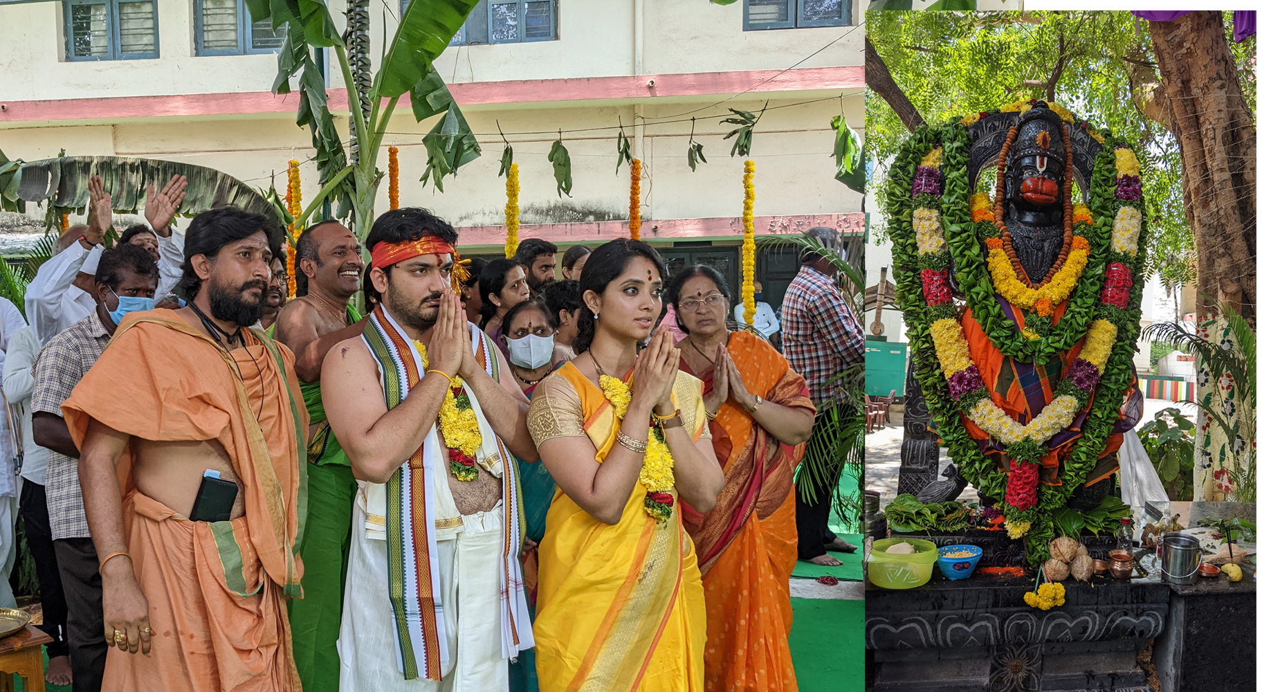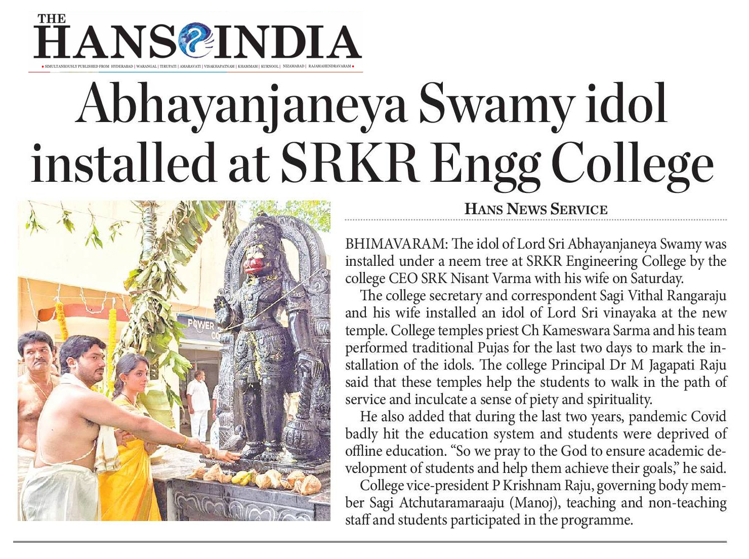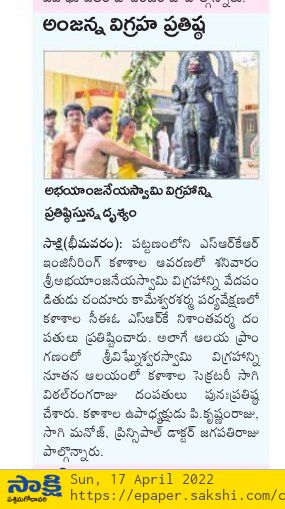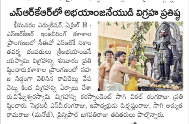 The idol of Lord Abhaya Anjaneya Swamy had been installed at the SRKR Campus by CEO Sri. SRK Nishanth Varma garu along with his wife and Lord Vinayaka idol had been reinstalled by Secretary and Correspondent Sri. SV Ranga Raju garu along with his wife in a traditional and spiritual environment on 16 th and 17 th of April, 2022 under the supervision of the priests Sri. Ch. Kameswara Sharma and his team. Principal Dr. M. Jagapathi Raju garu had said that it was a great gesture from the management to install the idols at the campus and urged the students to develop a sense of spirituality which will lead them towards success with confidence. He said that with the blessings of the almighty the pandemic should end shortly and wished that students should march ahead in the path of success. College Vice President Sri. P. Krishnam Raju garu, Governing Body Member Sagi Achutaramaraju Garu along with the HODs, Teaching, Non-Teaching staff and students participated in these rituals.