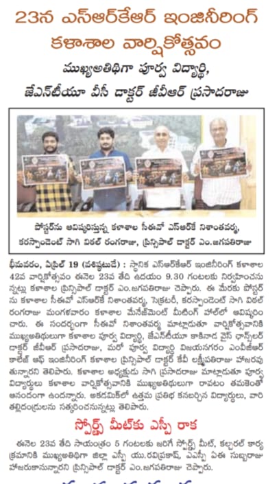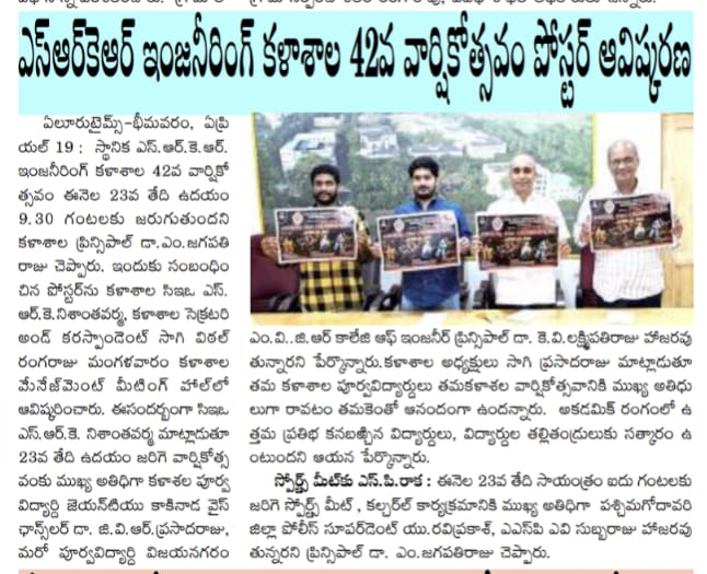 Principal of SRKR Engg College Dr. M. Jagapathi Raju garu had said that the Sports Day celebrations would be held at the college on 23rd April, 2022 at 5:30 PM for which Sri. Ravi prakash, Superintendent of Police of West Godavari Dist and ASP Sri. AV Subbaraju would be attending as the guests and give away the prizes to the students who had excelled in Sports. He invited all the students, parents, teaching and non teaching fraternity to attend all the programmes and make it a grand success.