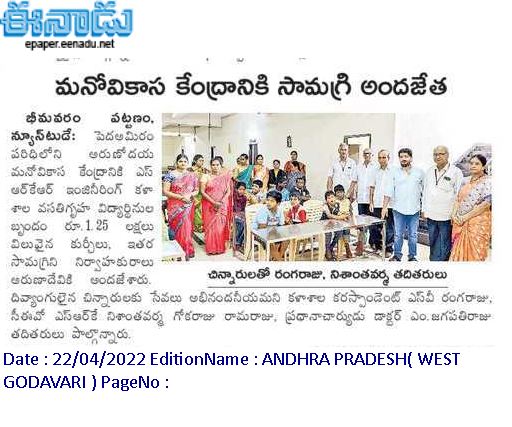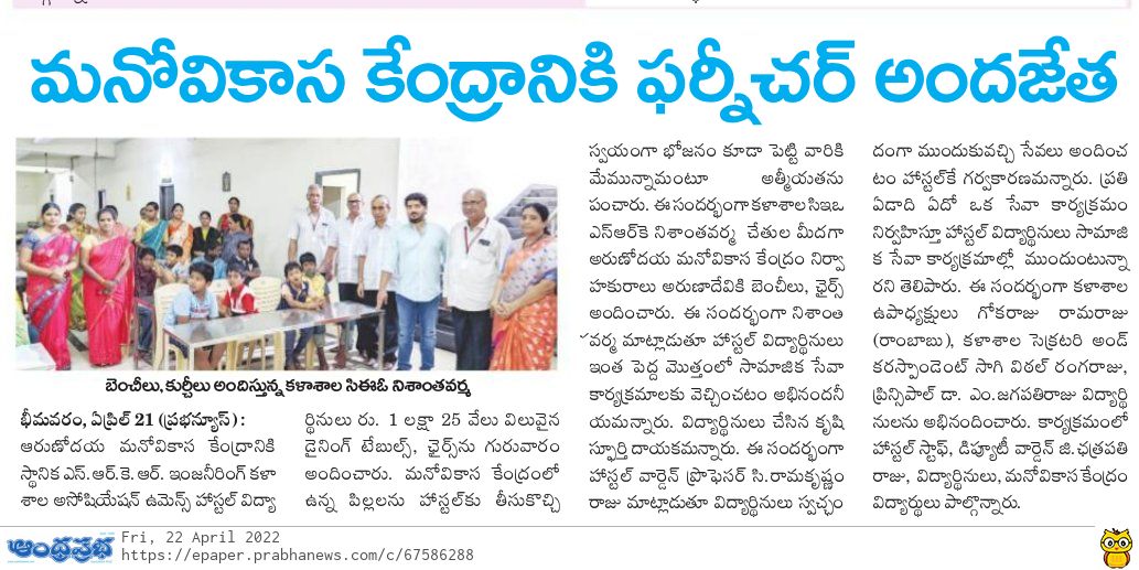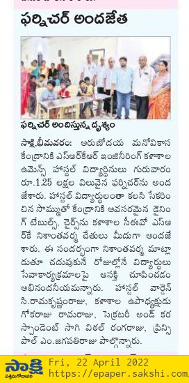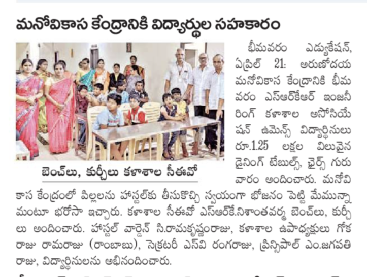 The hostel students of SRKR Engg College had displayed their noble heart and empathy by donating 1.25L valued furniture to Arunodaya Manovikasa Kendra of Bhimavaram through SRKR CEO Sri. Nishanth Varma Garu on 21st April, 2022. They invited the specially privileged students of the Kendra to the hostel and served the food and instilled a sense of confidence in them. Speaking on this occasion Sri. SRK Nishanth Varma garu had said that he was proud of the noble gesture of the students and appreciated them for their kind heart. Principal Dr. M. Jagapathi Raju garu and Hostel warden Prof C. Ramakrishnam Raju Garu had said that it’s really an inspirational act from the students and lauded them for their good deed. Vice President of SRKR Sri. G. Ramaraju, Secretary & Correspondent Sri. SV Ranga Raju, Deputy warden G. Chatrapathi raju and hostel staff took part in this benevolent activity.