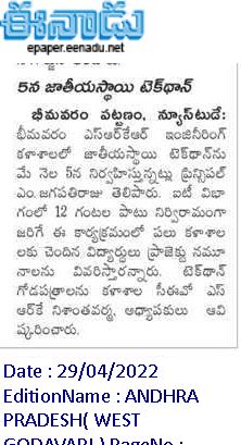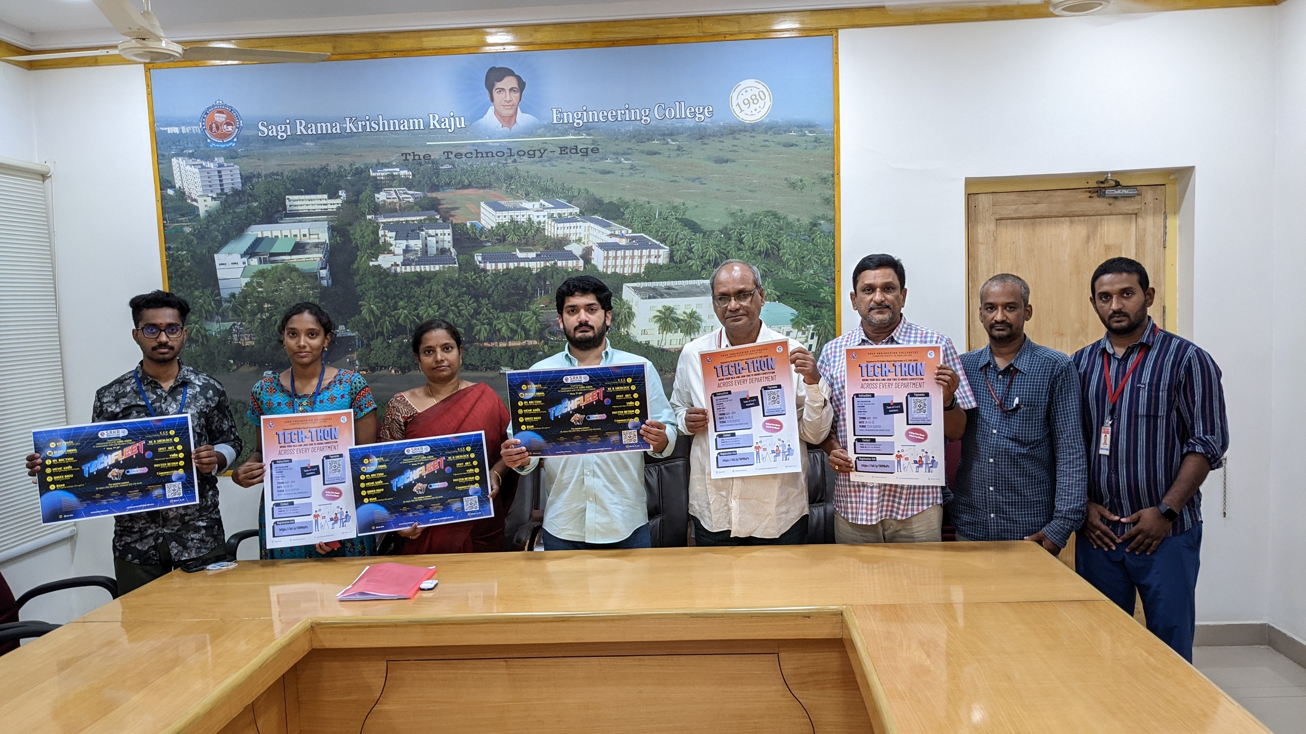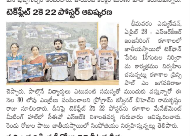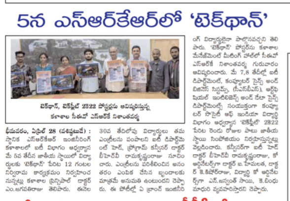 IT Dept of SRKR Engg College is conducting 12 hours hackathon named TECHTHON on 5th May, 2022, Principal Dr. M. Jagapathi Raju garu had said. IT Dept HOD Dr. BHV Ramakrishnam Raju had said that interested students should send their concepts by 30th of April, 2022. After scrutinizing the ideas, the shortlisted students would only be allowed to participate in this event. Students from any engineering stream can participate in this event. SRKR CEO Sri. SRK Nishanth Varma had inaugurated the poster of TECHATHON. Departments of IT, CSBS and AIDS in collaboration with Computer Society of India Student Chapter are going to organize Two Day National Level Symposium TECHFLEET 2K22 on May 7th and 8th. IT HOD Dr. BHV Ramakrishnam Raju is the Coordinator of this event and Dr. I. Hemalatha and Dr. K. Kishore Raju would act as Co-Coordinators and S. Jeswanth Sai and K. Bindu Maduri will act as Student Coordinators.