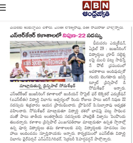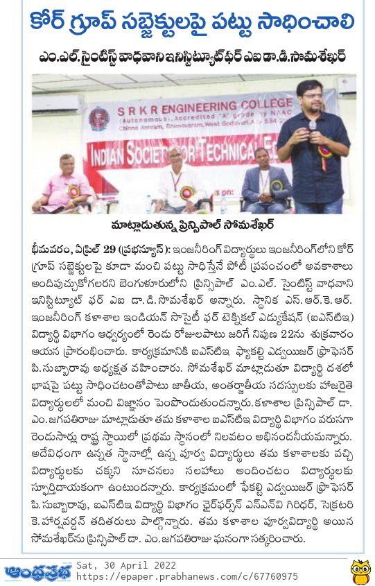 NIPUNA a two day event on recent changes in the industry by ISTE Student Chapter is being inaugurated on 22nd April, 2022 at SRKR Engg College by D. Somsekhar, Principal ML Scientist at Wadhwani Institute of AI, Bangalore. Speaking on this occasion he said that Engineering students should have grip on the group subjects in order to have a competitive edge in the today’s society. He emphasized that students should have command over the language and they should participate in various National and International events in order to have a bright future. Principal of SRKR Dr. M. Jagapathi Raju had said that it was really a matter of great pride and inspiration that the prominent alumni of the college are rendering their services for the growth of the institution. ISTE Faculty advisor Prof. P. Subbarao had presided over the meeting. ISTE Student Chapter Chairperson SSV Giridhar and Secretary Harshavardhan took care of the various arrangements of this event. The management had felicitated Mr. D. Somsekhar in a grand manner.