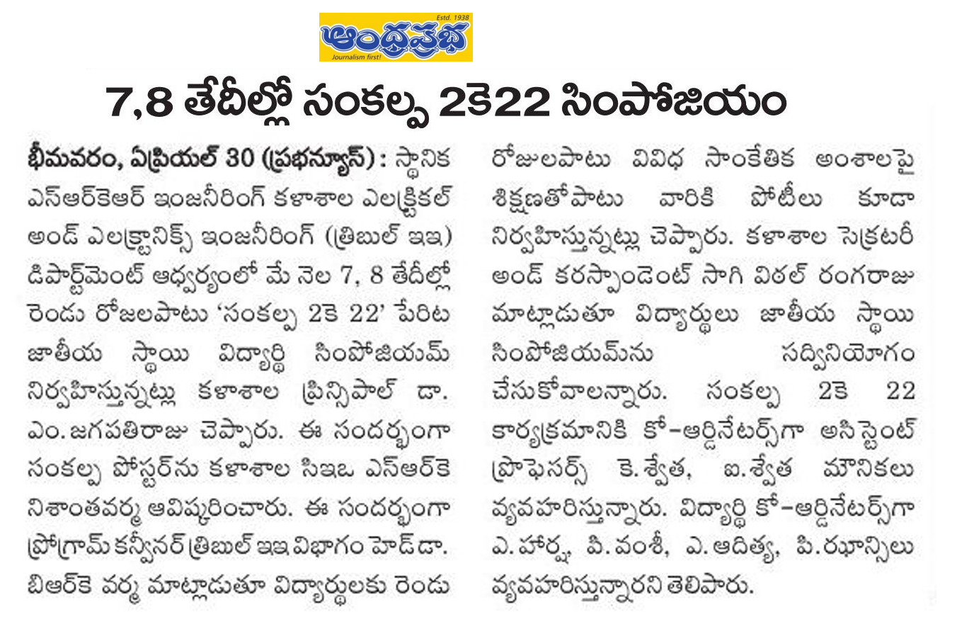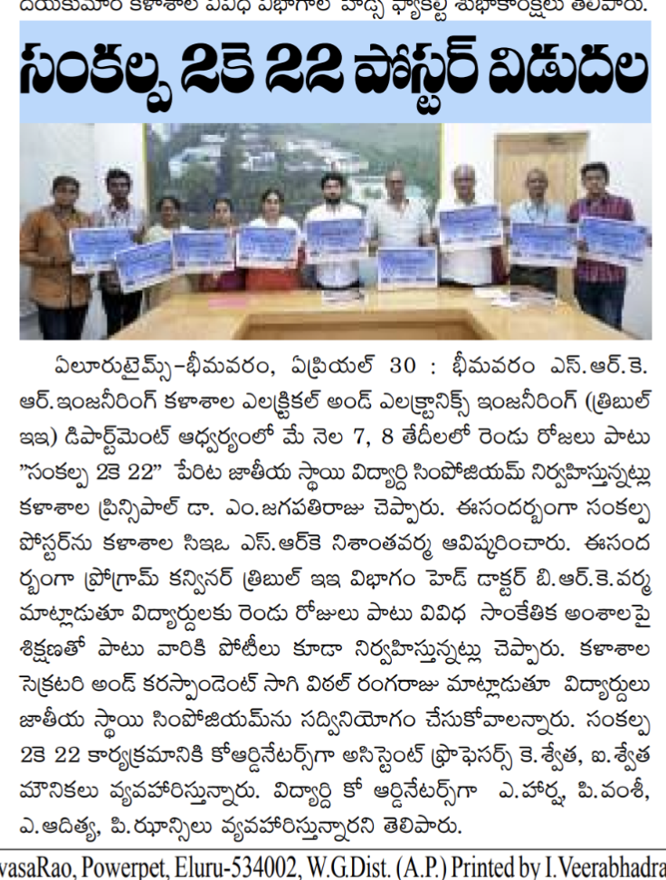 EEE Dept of SRKR was going to organize SANKALP 2K22 a National Level Student Symposium on 7th and 8th of May, 2022 Principal of SRKR Dr. M. Jagapathi Raju had said. The poster of the same was being inaugurated by CEO of SRKR Sri. SRK Nishanth Varma. Program convener and EEE HOD Dr. Varma had said that Students would be given training on various technical issues and various competitions would be conducted on these two days. Secretary and Correspondent of SRKR Sri. SV Ranga Raju had urged the students to make use of this symposium as a way for their bright future. Prof K. Swetha and I. Swetha Mounica will act as faculty coordinators and Mr. A. Harsha, Mr. P. Vamsi, Mr. A. Aditya and Ms. P. Jhansi will act as student coordinators for this symposium.