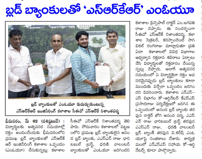 SRKR Engg College had entered an MOU with prominent Blood Banks in Bhimavaram which will facilitate the staff and students to avail blood during the case of emergencies. CEO of SRKR Mr. SRK Nishanth Varma had said that this MOU with Ananda Blood Bank, ASN Raju Charitable Trust and Dharani Voluntary Blood Bank will benefit the students and staff during the unforeseen circumstances. He also said that it is customary to conduct voluntary blood donation camps in the college every year by the students. Secretary & Correspondent of SRKR Sri. SV Ranga Raju, Principal Dr. M. Jagapathi Raju, NSS Coordinator KSN Prasada Raju and Blood Banks representatives Dr. Jogi Anand Varma, Mr. ASN Raju and Mr. V. Sirish took part in this noble activity.