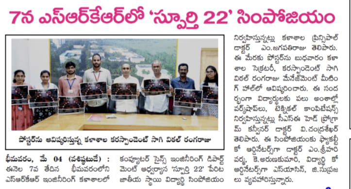 The Dept of CSE at SRKR is going to conduct National Level Student Symposium SPURTHI22 on May 7th, 2022 Principal Dr. M. Jagapathi Raju had said. The poster relating to the same was inaugurated by Secretary & Correspondent of SRKR Sri. SV Ranga Raju. Program convener an HOD of CSE Dr. Chandrasekhar had said that students would undergo various workshops and technical competitions as a part of this event. Dr. M. Srihari Varma and K. Aruna Kumari will act as Faculty Coordinators and S. Yasin and G. Supraja will act as student coordinators.