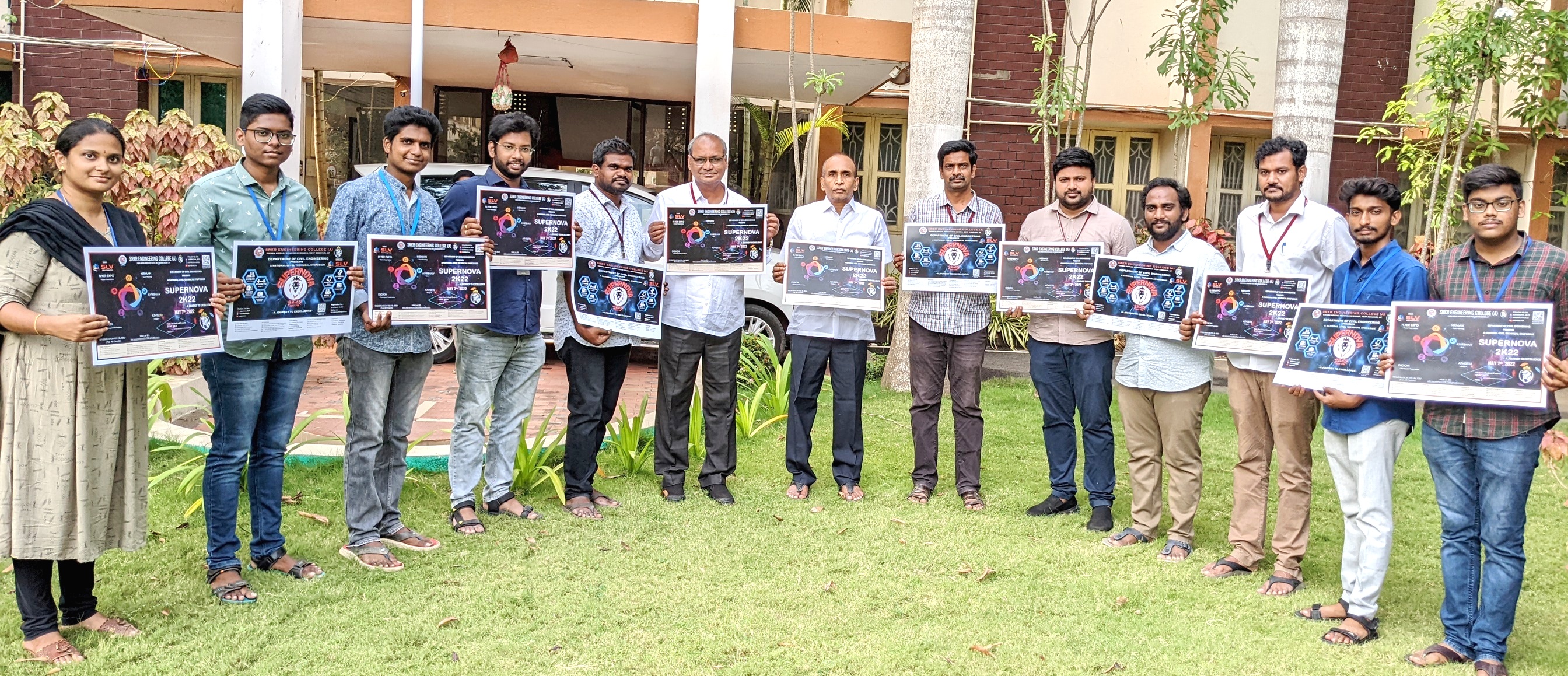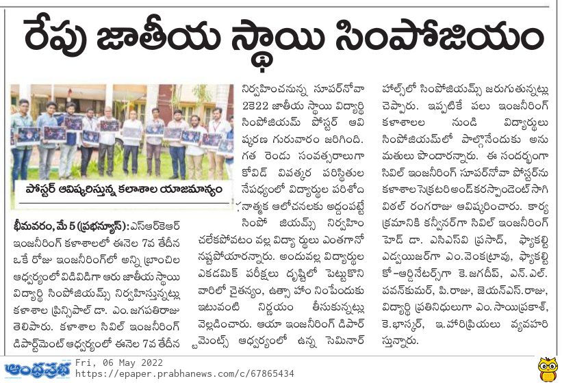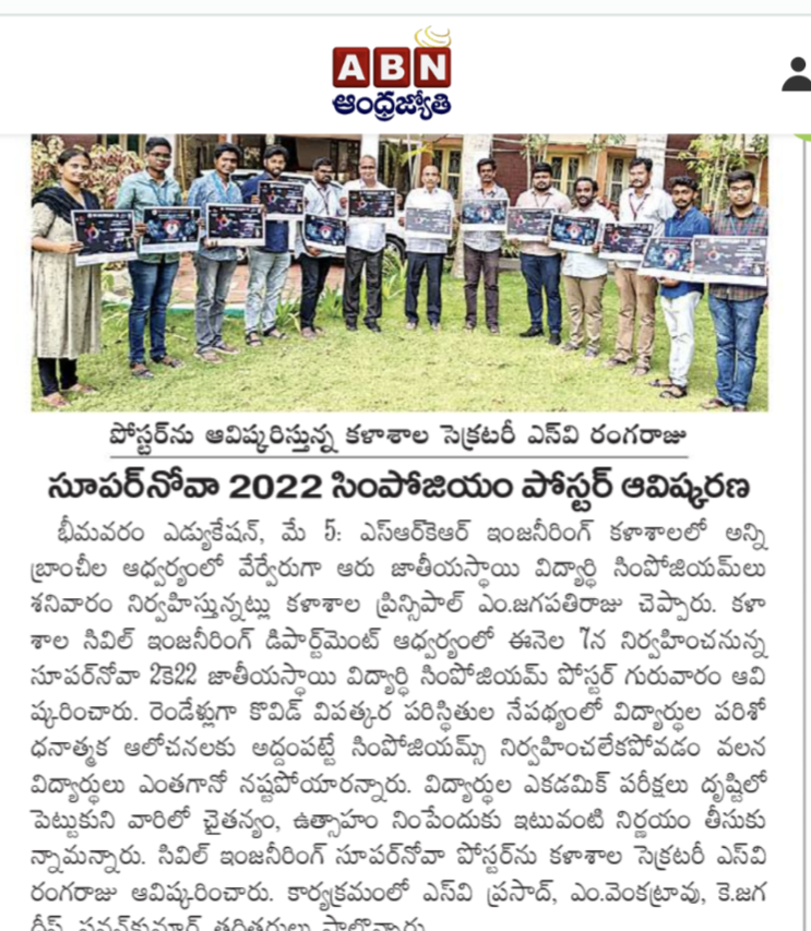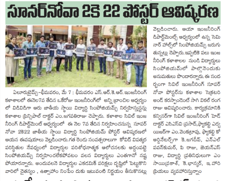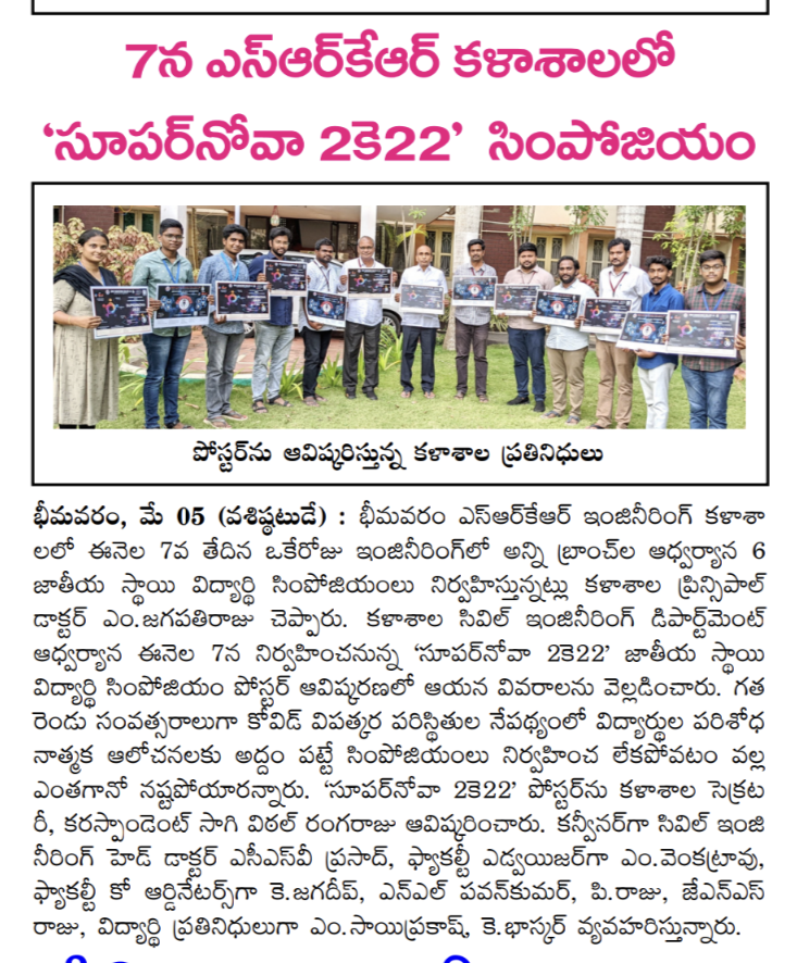 SRKR Engineering College is conducting 6 National Level Student Symposiums under various departments on 7th May, 2022 Principal Dr. M. Jagapathi Raju had said. The poster of SUPERNOVA 2022 the National Level Student Symposium by Civil Department has been inaugurated by Secretary& Correspondent of SRKR Sri. SV Ranga Raju. Principal had said that because of the Covid Pandemic the symposiums were not being conducted during the last 2 years which had an adverse effect on the research and analytical skills of the students. Keeping in view the upcoming academic examinations, in order to infuse enthusiasm and passion in the students, these symposiums were being planned. Civil dept HOD Dr. Prasad will act as convener, Mr. M. Venkat Rao will act as Faculty Coordinator, K. Jagadeep, Pavan Kumar, P. Raju, JNS Raju will act as Faculty Co-Coordinators and M. Saiprakash and K. Bhaskar will act as Student representatives for this SUPERNOVA2022.