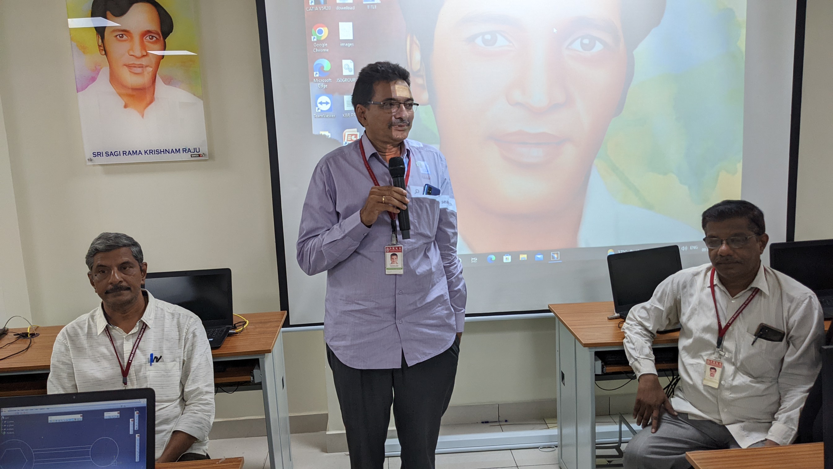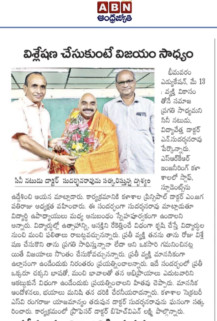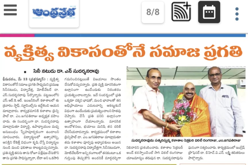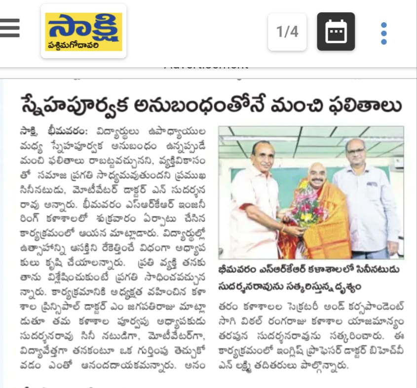Prominent film actor and former Professor of SRKR Sri. Sudarshan Rao had interacted with the staff and students of SRKR Engineering College on 12th May, 2022. He said that it is only through individual development the society will be developed. Teachers should maintan a friendly relationship with the students. It is the teacher’s duty to provoke anxiety and enthusiasm among the students towards the studies. Every human being should introspect everyday whether he is in the development mode or not through which he will be successful. Everyone should have clarity in their thoughts in language through which he can clearly define himself to others. Everyone should pay proper attention to their mental fitness too. Principal of SRKR Dr. M. Jagapathi Raju had presided over this meeting. Secretary& Correspondent of SRKR Sri. SV Ranga Raju had felicitated the guest on behalf of the management.