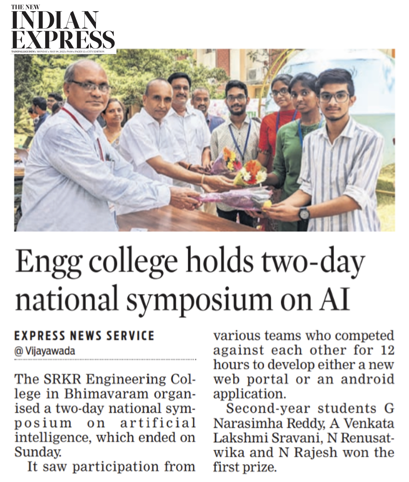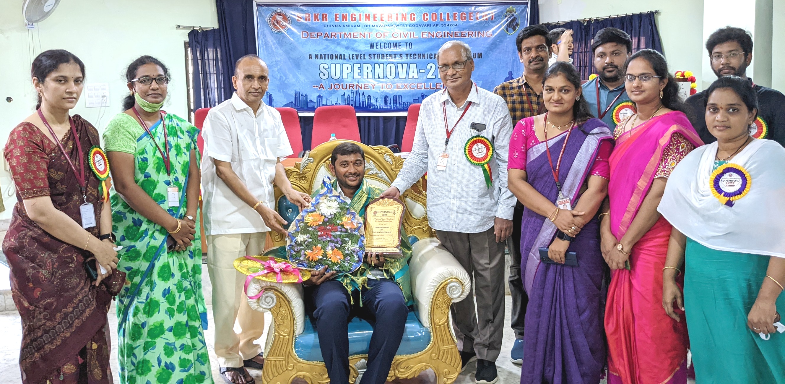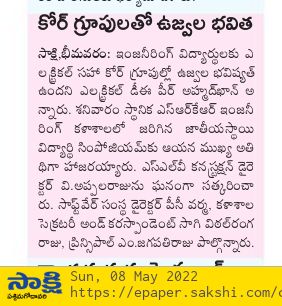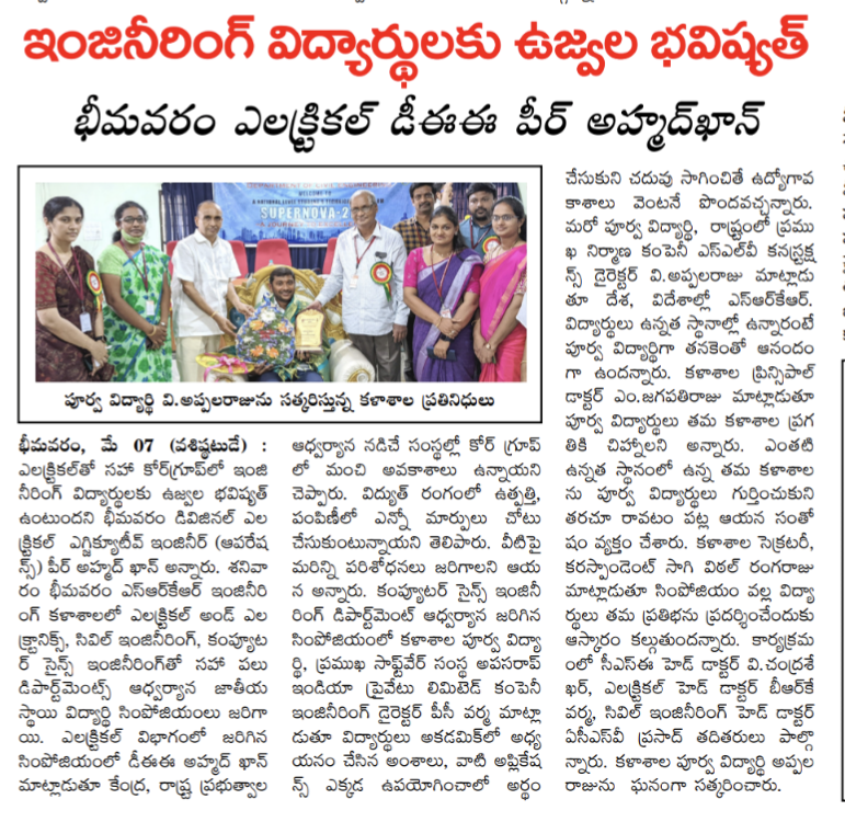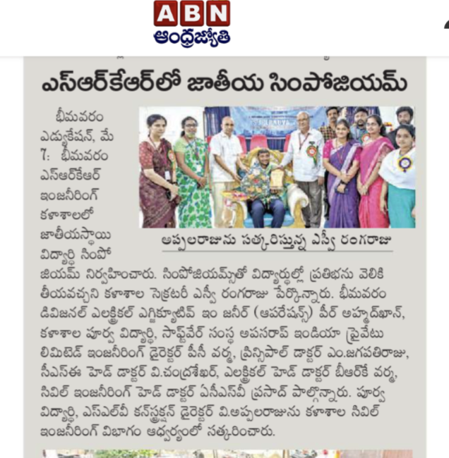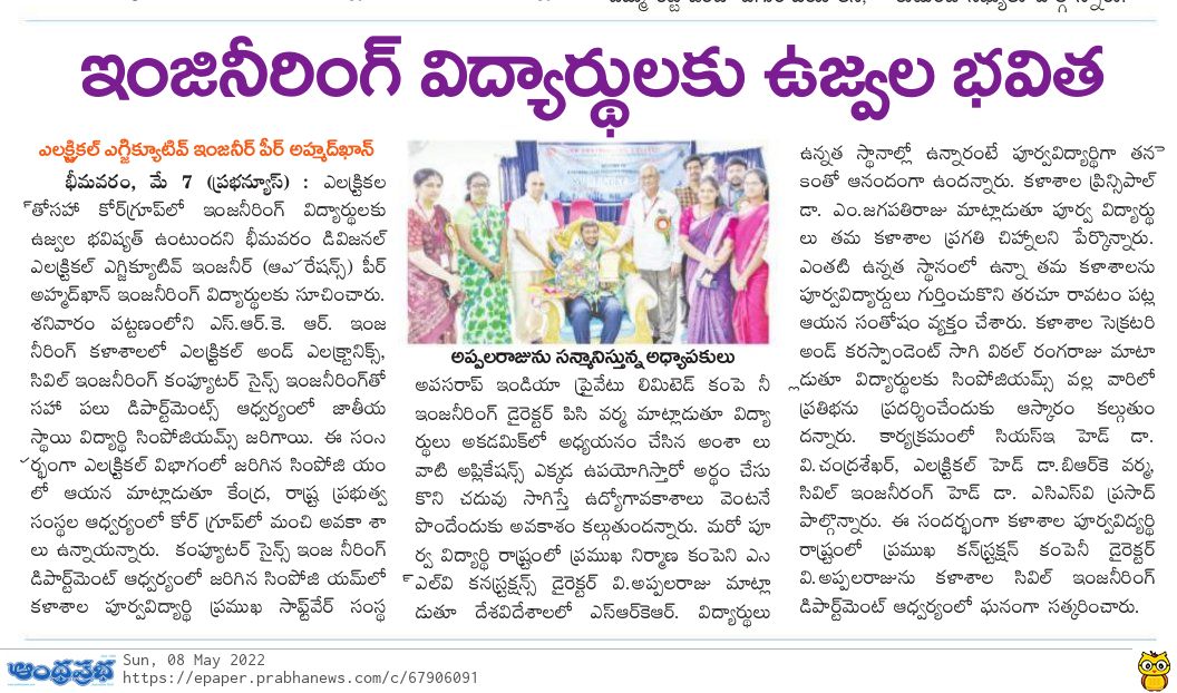 National Level Student Symposiums were being conducted by various departments at SRKR Engg College on 7th May, 2022. Divisional Electrical Executive Engineer (Operations) of Bhimavaram Mr. Peer Ahmed Khan who was the chief guest at Symposium of EEE Dept had said that students are going to have a bright future in core branches. Chief Guest of CSE Dept Symposium Mr. PC Varma, a prominent Alumni of SRKR and Director of a Software Company had suggested the students to learn the applications of software in various fields through which they will have a good chances of getting prominent jobs. Chief Guest of Civil Dept Symposium Mr. V. Appalaraju, Director of Prominent Construction Company SLV had said that it was indeed a matter of great pride that alumni of SRKR are in prominent positions across the globe. Principal Dr. M. Jagapathi Raju had said that alumni of SRKR are the symbols of development and their frequent visits to the institution are of great help in guiding the present students. Secretary&Correspondent of SRKR Sri. SV Rangaraju had said that Symposiums will provide a platform for the students to showcase their skills and talents. HODs of various departments had participated in these symposiums and the chief guests were felicitated by the management in a grand manner.