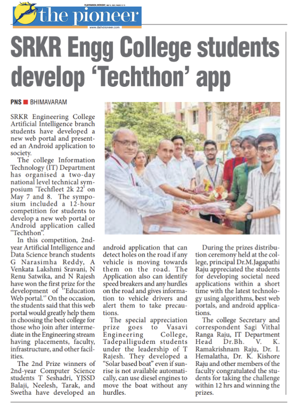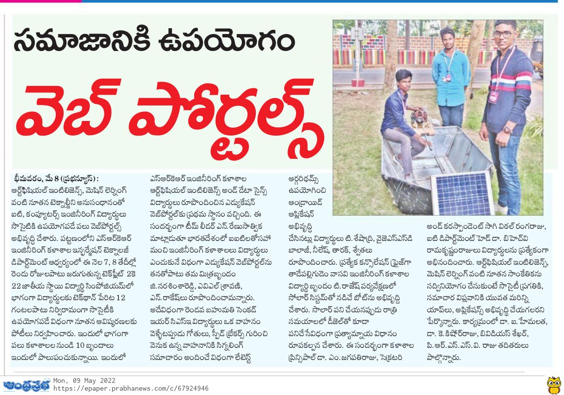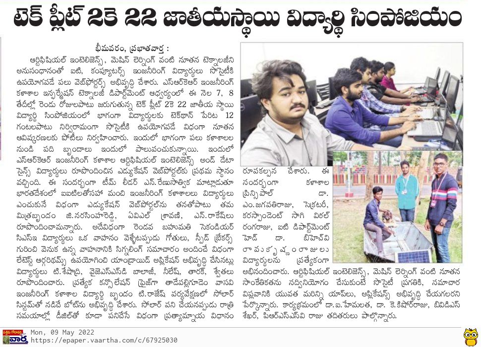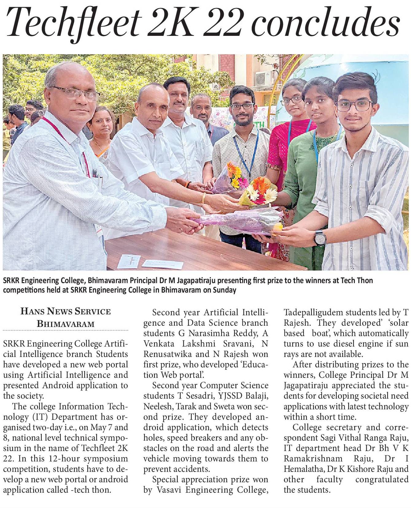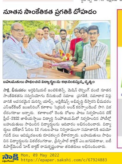 IT Dept at SRKR Engg College had conducted 12 hours uninterrupted hackathon named as TECHFLEET2K22 where engineering students had developed web portals using the latest technologies like Artificial Intelligence and Machine Learning. 10 student groups were shortlisted for this programme from various colleges across the state. The student group from SRKR stood first in this competition where they developed an education portal which will be significant help to the students while selecting the educational institutes where they want to pursue their education. Second place was secured by the students of CSE who developed an android application with latest algorithms which will help the vehicles to detect the speed breakers and major disruptions on the road while driving. Consolation prize was won by the students of Vasavi Engg College, Tadepalligudem who developed a boat which will work with the solar energy and in the absence of solar energy this boat also works on diesel. Secretary&Correspondent of SRKR Sri. SV Rangaraju, Principal of SRKR Sri. M. Jagapathi Raju and HOD of IT Dept Dr. BHV Ramakrishnam Raju had congratulated the students for being a part of this novel programme and urged the students to make use of AI and Machine Learning through which new applications and apps can be developed for the welfare of the society and this would act as a foundation of revolution of communication. Dr. I. Hemalatha, Dr. K. Kishore Raju, BVDS Sekhar, PRSSV Raju had also participated in this programme.