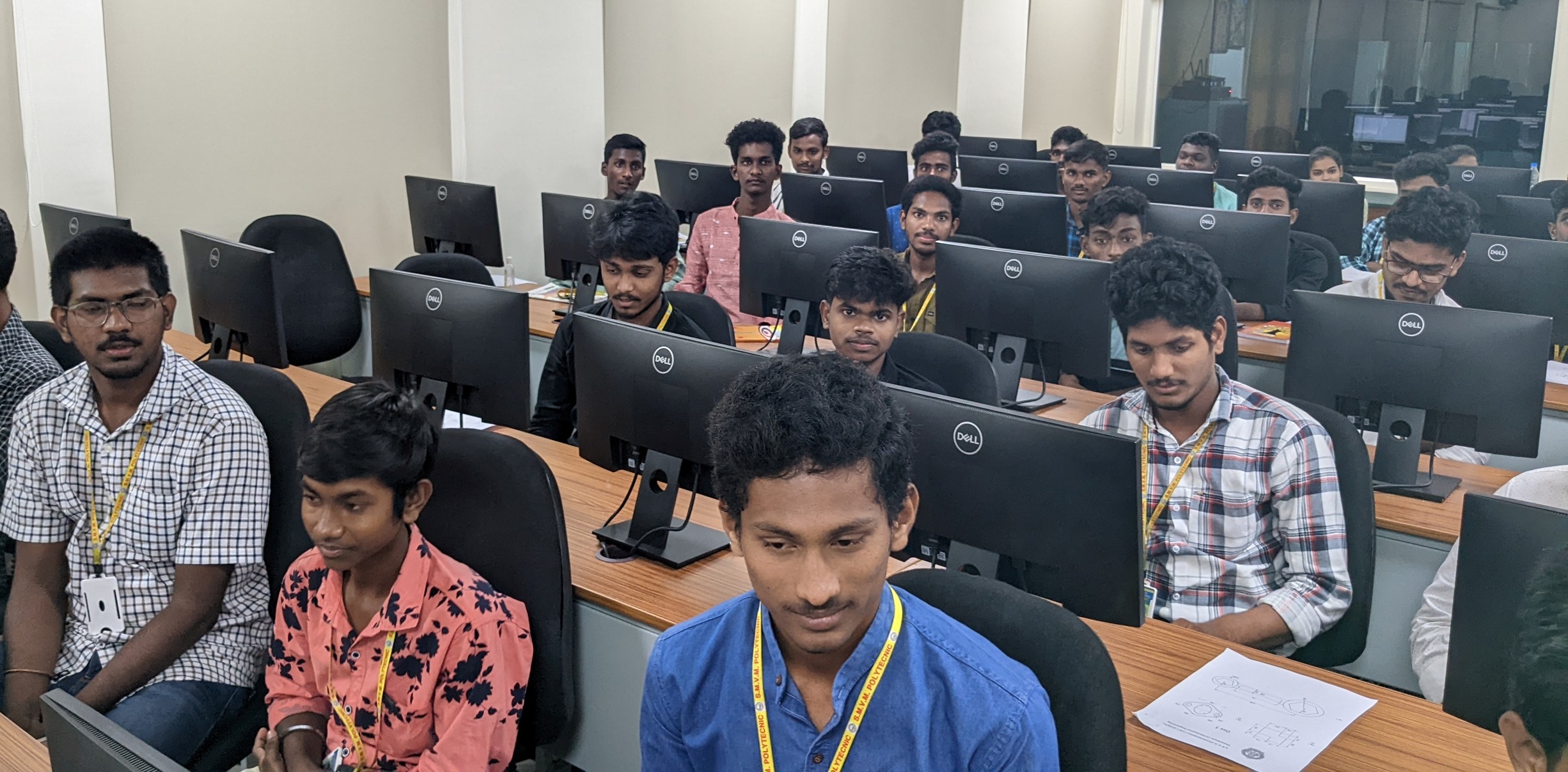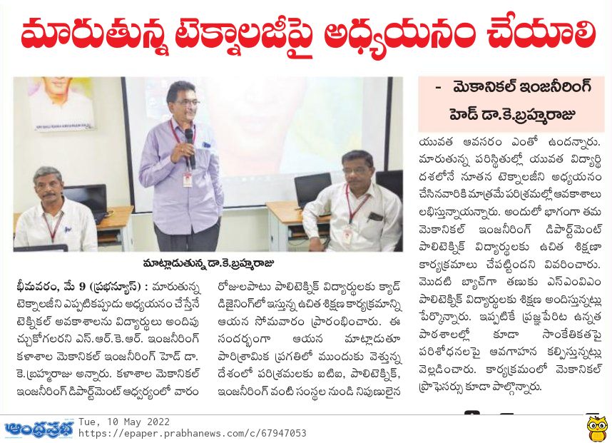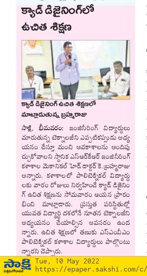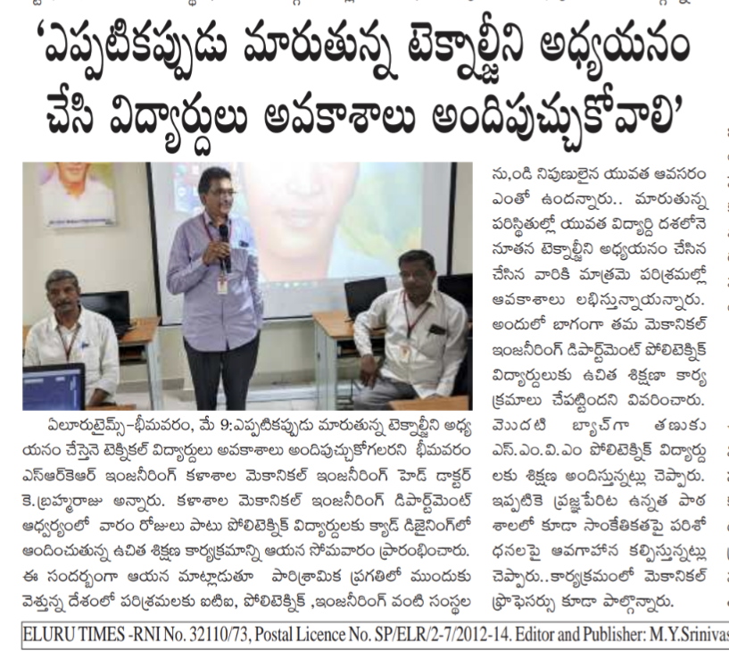 The Mechanical Dept had started a noble initiative of giving free training to the polytechnic students of SMVM Polytechnic, Tanuku on CAD Design for one week. The training session has been inaugurated at the campus yesterday. Speaking on this occasion HOD of Mechanical Dr. Brahmaraju had said that students should upgrade themselves in accordance with the latest technologies and then only they can land in their dream job. India is today marching ahead in Industrial Revolution and is in dire need of skillful employees from ITI, Polytechnic and Engineering streams and the students with latest skills and technologies will only have a bright career. The dept had already created awareness sessions on Mechanical Engineering at the school level by an initiative named as 'Prajna'. Mechanical Dept staff had participated in this programme.