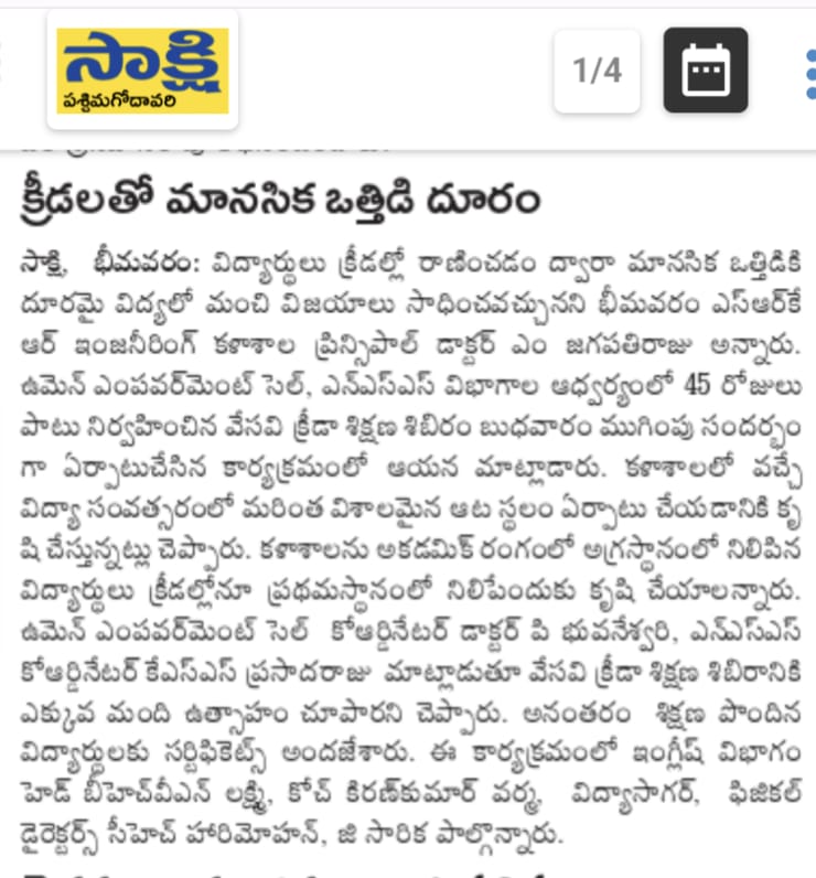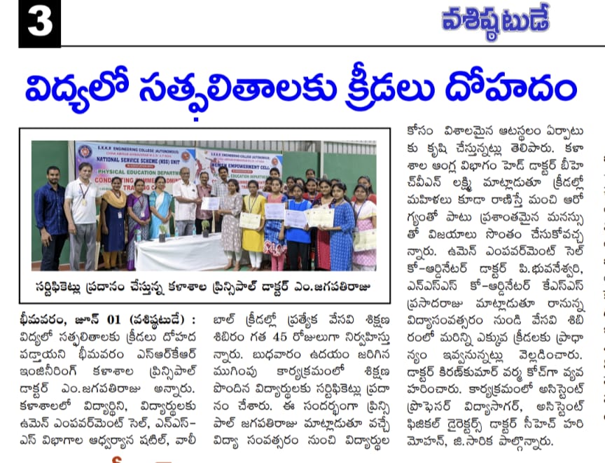 The shuttle coaching camp at SRKR which was being conducted for the last 45 days has ended on 31st May, 2022. This was organized in collaboration with Women Empowerment Cell, NSS Unit and Physical Education Dept. Speaking on this occasion, Principal Dr. M. Jagapathi Raju had said that students can reduce their mental tensions and emerge victorious by taking part in various sports. He said that the management is planning to provide better sports infrastructure to the students and je urged the students to keep up the name of the college in sports arena too along with the academic arena. Women Empowerment Cell Coordinator Dr. Bhuvaneshwari and NSS Coordinator Mr. Prasada Raju had said that there was huge response from the students towards this camp. Head of English Dept Dr. Lakshmi, Coach Dr. Kirankumar Varma, Vidyasagar and Physical Directors G. Harimohan and Ms. Sarika also took part in this programme.