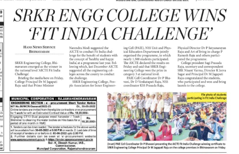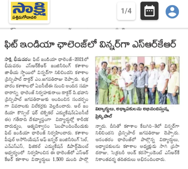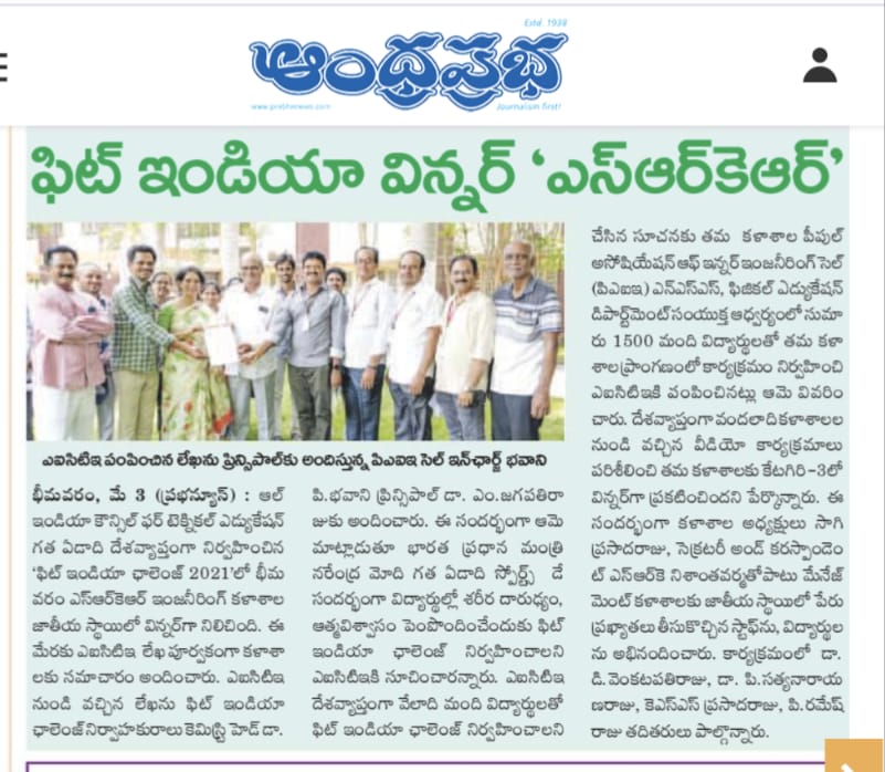 SRKR Engineering College emerged as the winners in the 'FIT INDIA' Challenge conducted by AICTE last year. AICTE has issued a letter in this regard and the same was handed over to Principal Dr. M. Jagapathi Raju by Dr. Bhavani Head of Chemistry Dept and organizer of Fit India Challenge. Speaking on this occasion, Dr. Bhavani had said that as per the vision of our PM Sri. Narendra Modi, AICTE had requested the educational institutes across the country to conduct this challenge in order to increase the physical and mental strength of the students. SRKR had conducted this challenge with 1500 students in collaboration with PAIE (People Association for Inner Engineering) Cell, NSS Unit and Physical Education Dept. AICTE after scrutinizing the videos of hundreds of colleges across the country, SRKR was declared as the winner in Category III. College President Sri. Prasada Raju, Secretary & Correspondent Sri. Nishanth Varma had congratulated the staff and the students for bringing laurels to the institute. Dr. Satyanarayana Raju, Dr. Venkatapathi Raju, Prasada Raju and Ramesh Raju also participated in this occasion.