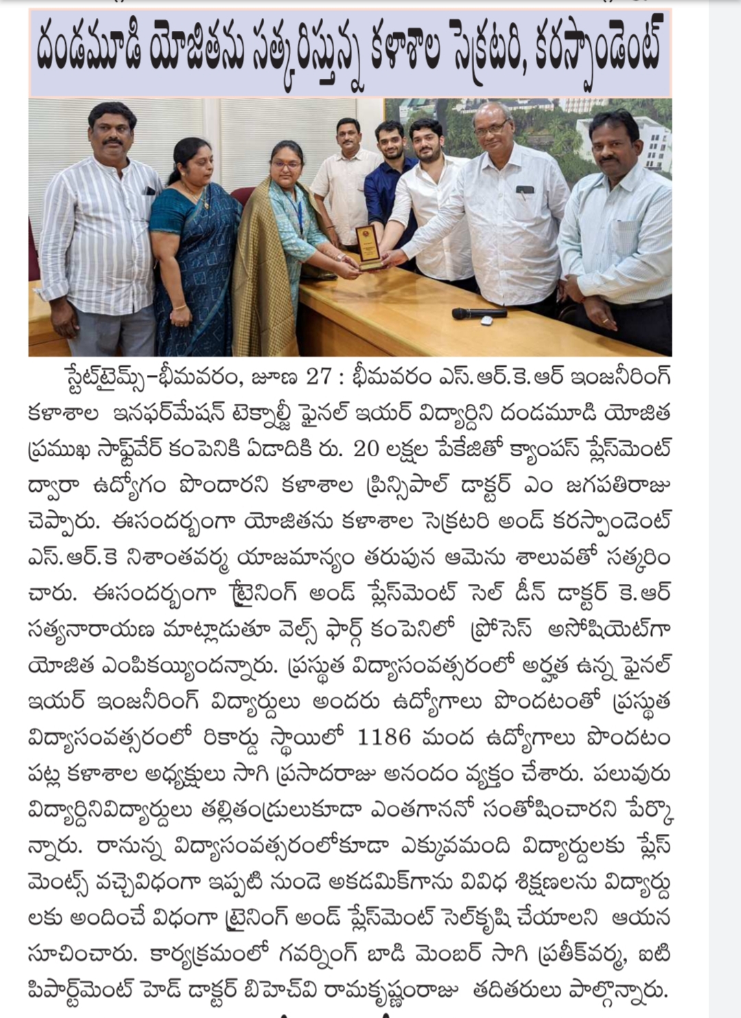 Final Year IT student Ms. Yojitha Dandamudi was selected for prominent IT Company WELLS FARGO with a package of 20 LPA. The management had felicitated her on this occasion. Speaking on this occasion Dean Placements Dr. Satyanarayana had said that Yojitha was selected as a Process Associate at Wells Fargo. President of SRKR Dr. Prasad Raju had expressed his happiness that all the eligible Final Year students had been placed with a record placement of 1186 offers. The students as well as their parents are very happy about these rare feet. Secretary Cum Correspondent of SRKR Sri. SRK Nishanth Varma and Governing Body Member Mr. Pratik Varma had suggested the placement team to start the training for the upcoming batches on war front and make sure that the placements increase year by year. HOD of IT Dept Dr. BHV Ramakrishnam Raju had also participated in this occasion.