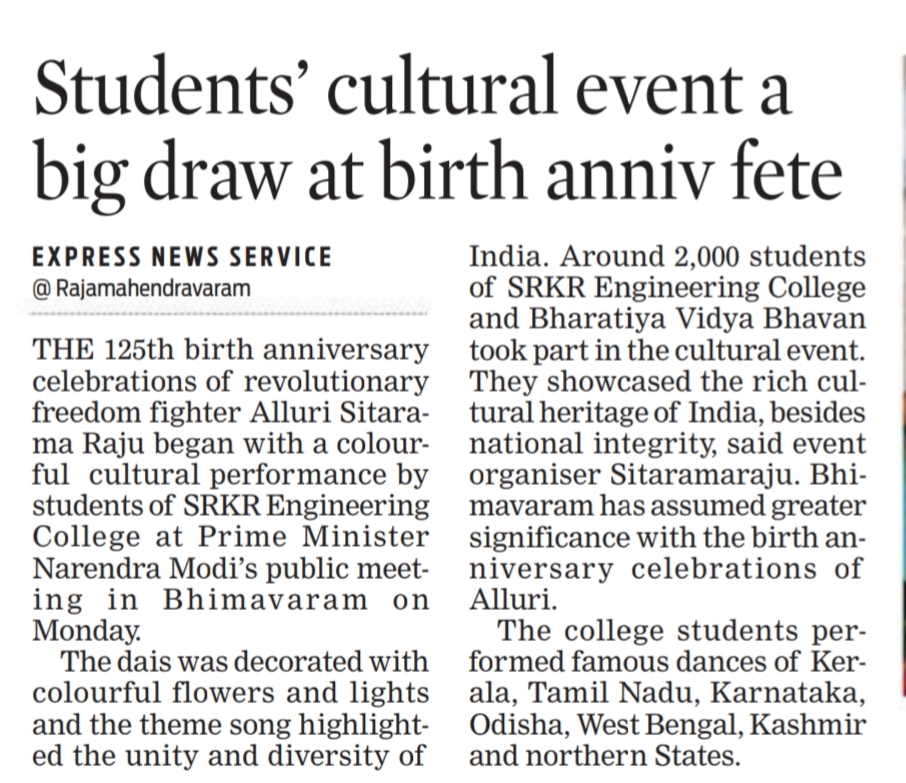 The students of SRKR Engineering College had stolen the show at the PM Modi's meet at Bhimavaram on 4 th of July, 2022 on the occasion of 'Azaadi Ka Amrit Mahotsav' and '125th Birth Anniversary Celebrations of Alluri Sitarama Raju'. Around 3000 students and 1000 staff members from the college wearing the tricolour t-shirts depicting the national integrity attended the program