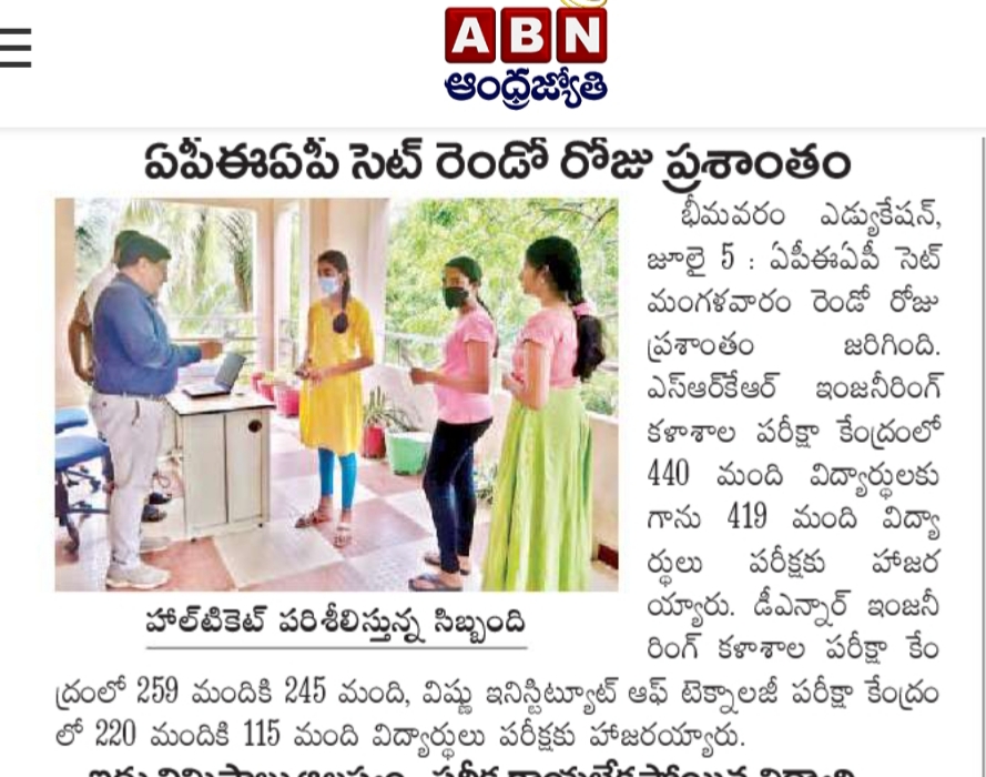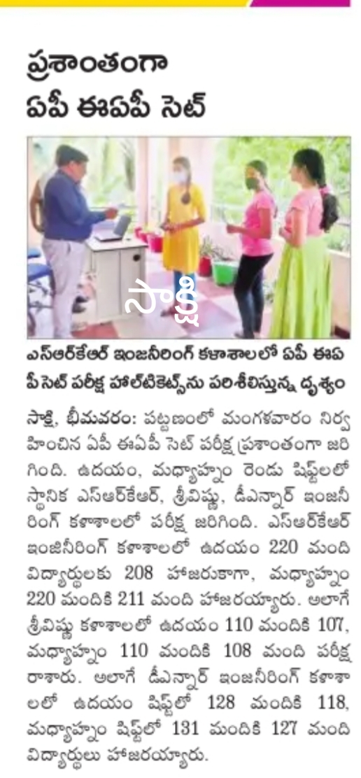 EAPCET 2022, the common entrance test for Engineering, Agriculture and Pharmacy Courses by the Govt of Andhra Pradesh was conducted smoothly on the second day (05-07-22) at SRKR Engineering College. Out of registered 440 students, 419 students attended the examination. Principal of SRKR Dr. M. Jagapathi Raju and team coordinated the examination process and made sure that it is done smoothly.