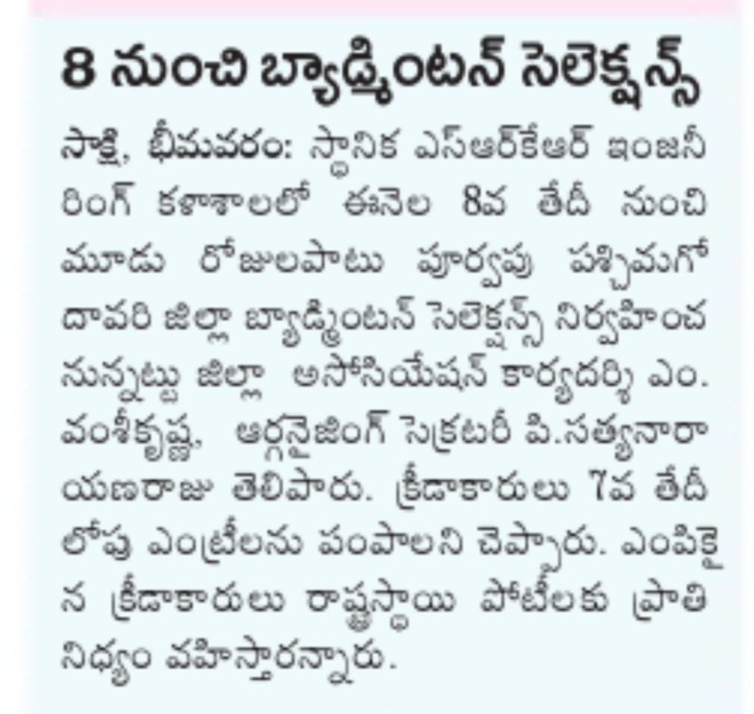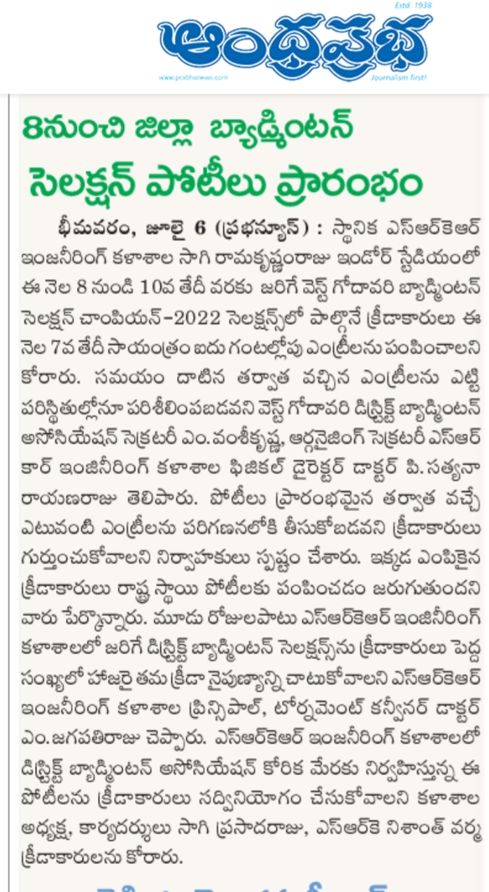 The Badminton selections of the old West Godavari District are going to be conducted at the SRKR Engineering College, Bhimavaram from 8th of July, 2022 said Secretary of the District Association Mr. Vamsi Krishna and Organising Secretary Dr. P. Satyanarayana Raju. Interested players are requested to submit the entries by the end of the day on 7th July, 2022. Winners of this selections will be playing at the State Level Championship. Principal of SRKR and Tournament Convener Dr. M. Jagapathi Raju had requested the interested players to avail this opportunity and he thanked the management or SRKR for their valuable support in conducting this event.