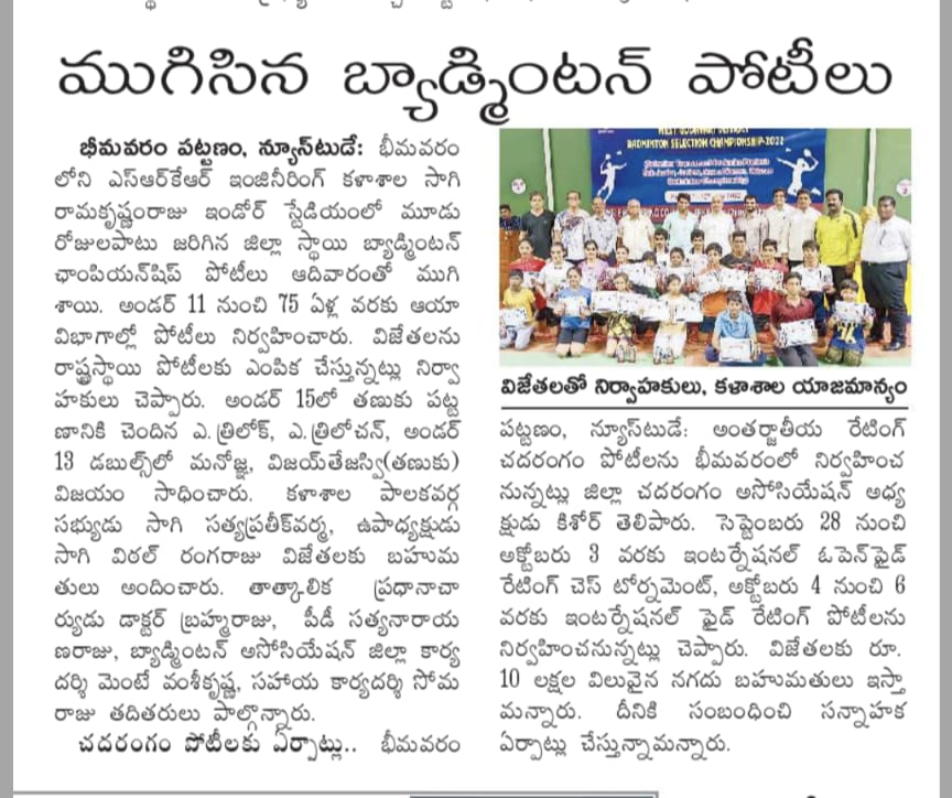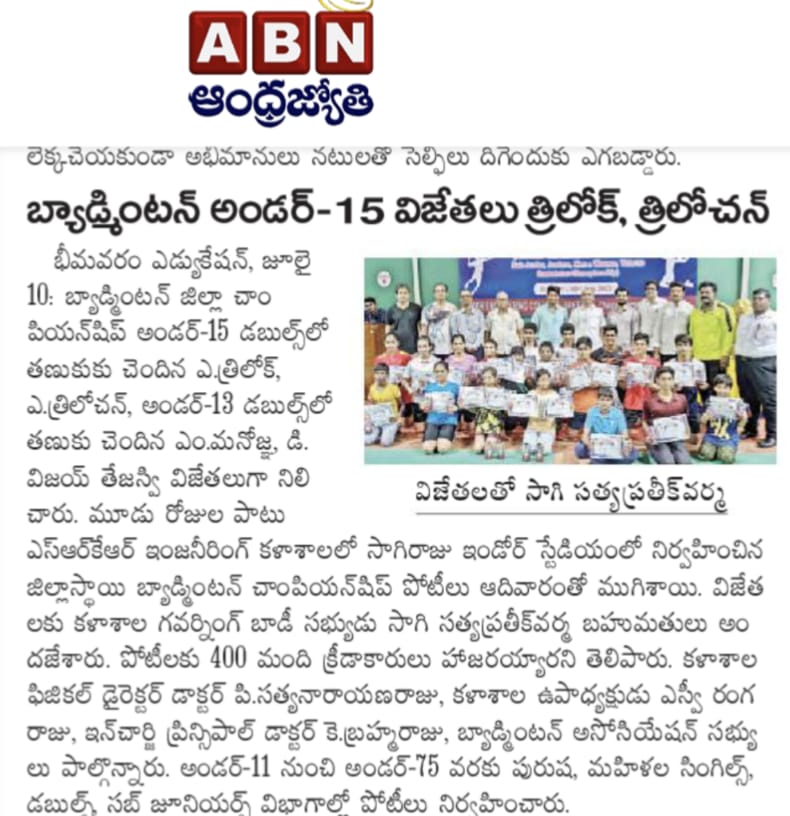 The district badminton selections that are being conducted at SRKR from the last 3 days had ended on 10th July, 2022 in a very grand manner. The prizes were distributed to the winners by Governing Body Member of SRKR Mr. Pratik Varma and Vice President of SRKR Mr. SV Ranga Raju. 400 Participants and 650+ matches were being conducted as a part of this event. In charge Principal of