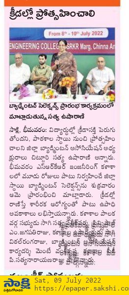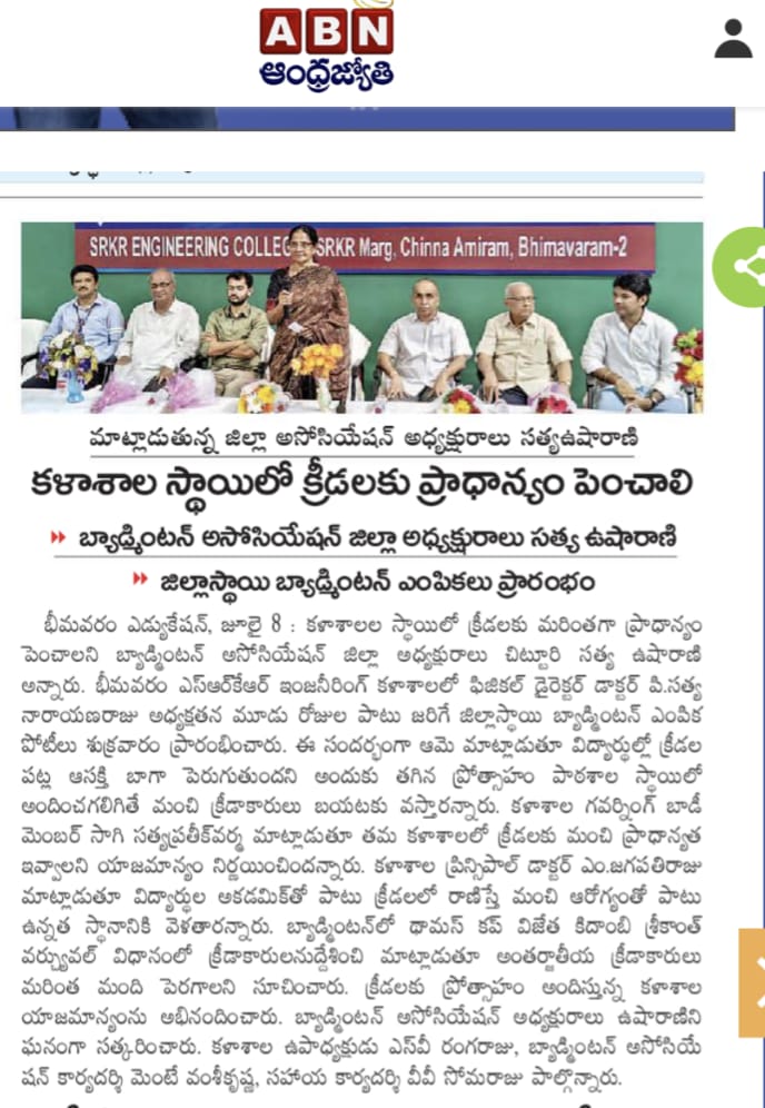 The West Godavari District Level Badminton selections were inaugurated at the SRKR Engineering College on 8th July, 2022. Speaking on this occasion West Godavari Badminton Association President Smt. Chitturi Satya Usha Rani had said that its high time that the sports should be given prime importance right from the school level, then we can be able to produce some great players. Governing Body Member of SRKR Sri. S. Pratik Varma had said that at SRKR the management is committed to support sports too along with the studies. Principal of SRKR Dr. M. Jagapathi Raju had said that students should give importance to sports too along with the studies, so that they can grow in their respective careers. Thomas Cup winner and prominent badminton player of India Sri. Srikanth Kidambi inaugurated the event virtually and said that in the coming days more players should represent India at the National Level. He thanked the management of SRKR for giving prime importance to sports. Smt. Usharani was grandly felicitated by the management on this occasion. Vice President of SRKR Sri. SV Ranga Raju, Secretary of Badminton Association M. Vamsi Krishna, Co-Secretary Sri. VV Somaraju had graced this occasion.