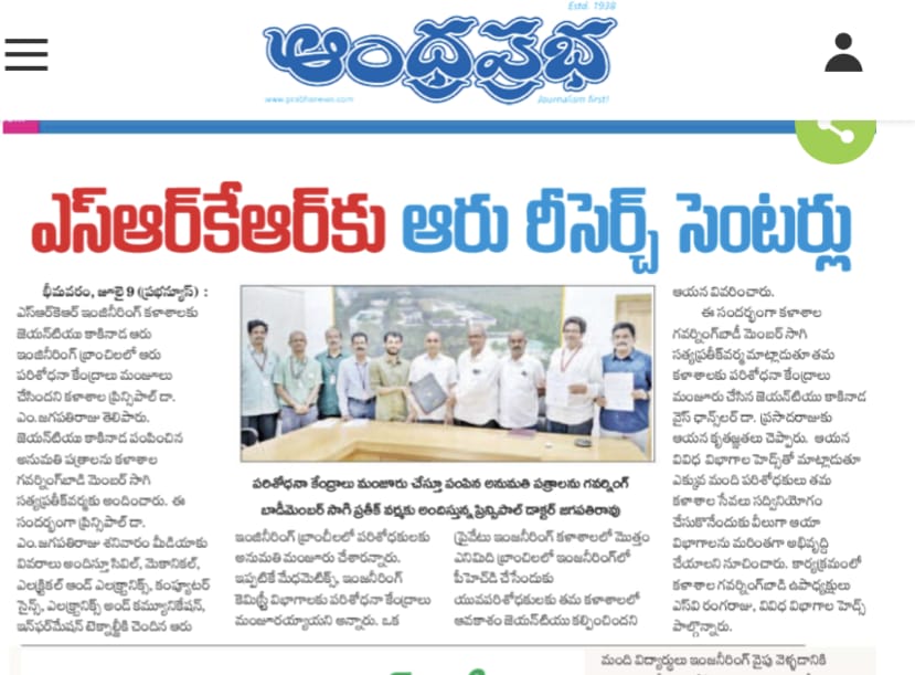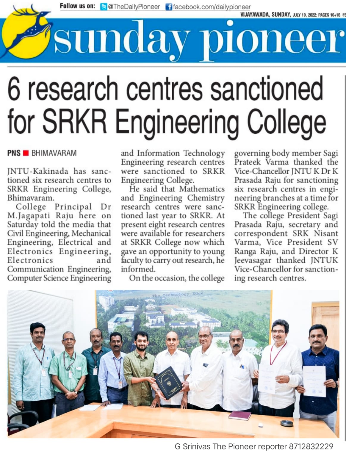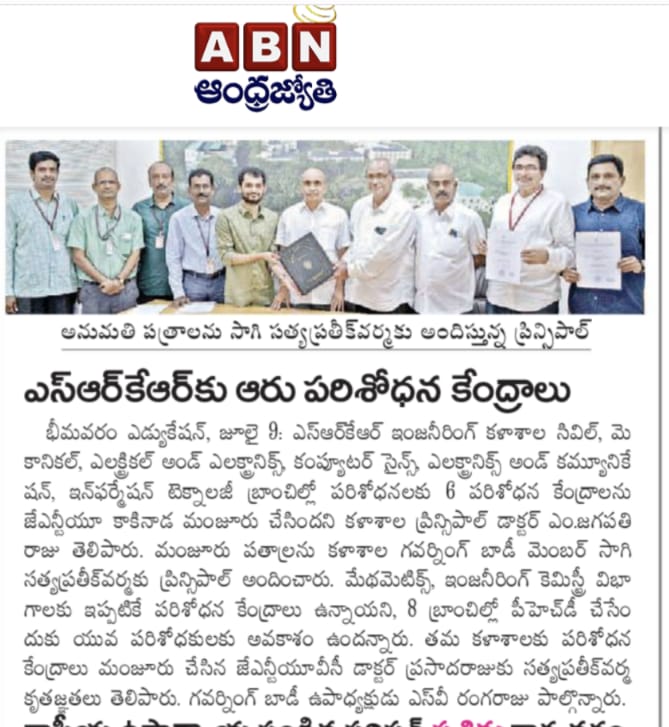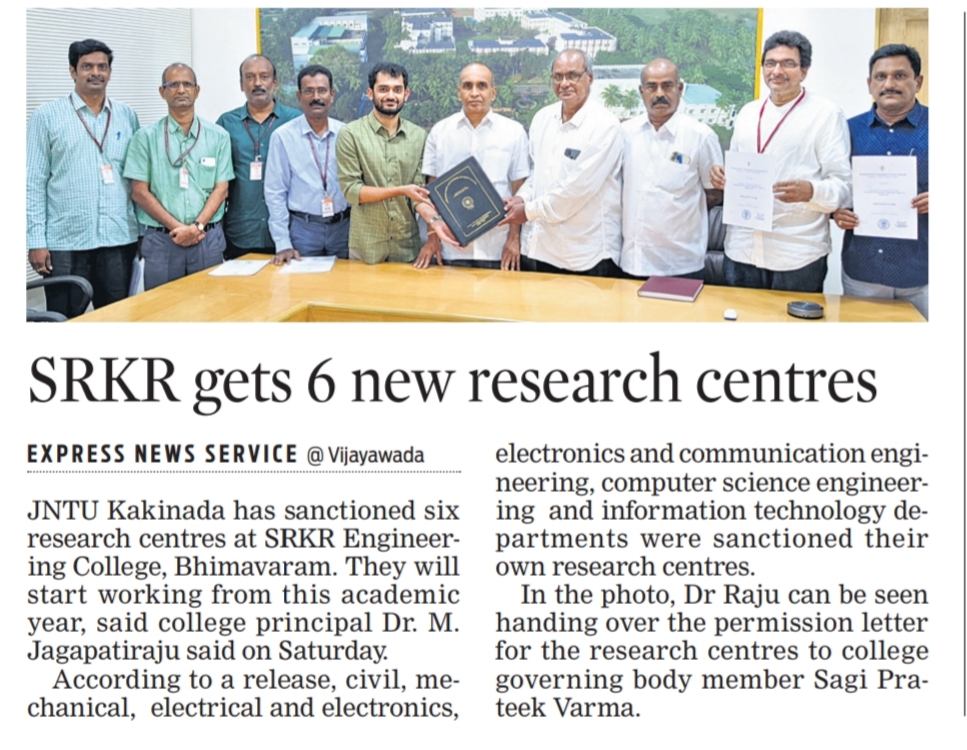 JNTUK has conferred 'Research Centre' status to the departments of CSE, IT, ECE, EEE, Civil and Mechanical Engineering; Principal of SRKR Dr. M. Jagapathi Raju had said. The documents relating to the same were being handed over to Governing Body Member of SRKR, Mr. S. Satya Pratik Varma. Mathematics and Chemistry Departments are already having the research centre status and so it’s a huge opportunity for the young researchers to pursue their research in these 8 departments, principal had said. Mr. Pratik Varma had thanked the VC of JNTUK for grating the research centres and giving an opportunity to promote the research. Vice-President of SRKR Mr. SV Ranga Raju and the HOD’s of CSE, IT, ECE, EEE, Civil and Mechanical Departments participated in this meeting.