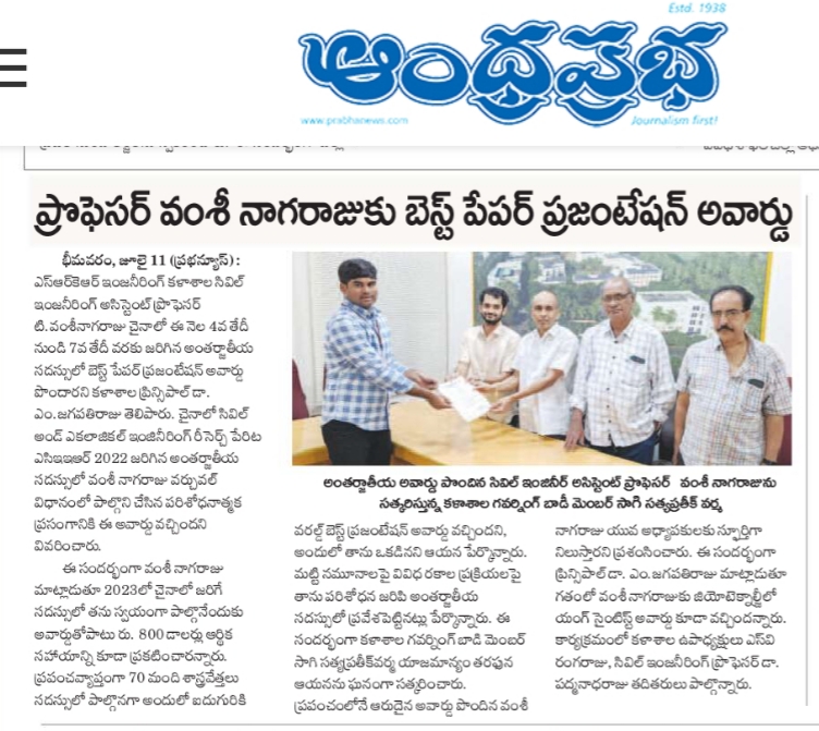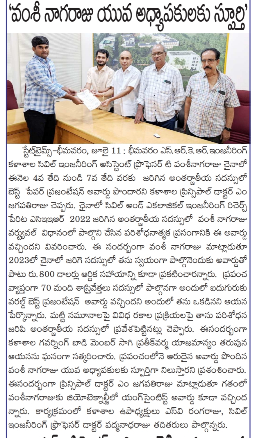 Mr. Vamsi Nagaraju, Assistant Professor in the Civil Dept at SRKR Engineering college had got the Best Paper Presentation Award at the International Conference ACEER 2022 conducted in China from 4th to 7th of July said Principal of SRKR Dr. M. Jagapathi Raju. Mr. Vamsi had said that along with the award, he received a financial assistance of 800 USD. Best Paper Presentations were awarded to 5 faculties in the world and he is one among them. Governing Body Member of SRKR Mr. Pratik Varma had felicitated Mr. Vamsi on this occasion and said that all the faculty in the college should take this as an inspiration. SRKR Vice President Sri. SV Ranga Raju and Civil Engineering Dept Professor Dr. Padmanadha Raju took part in this occasion.