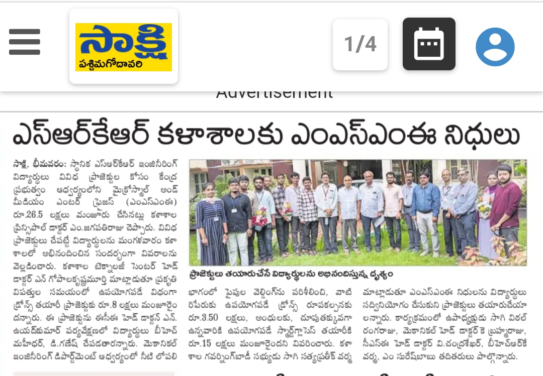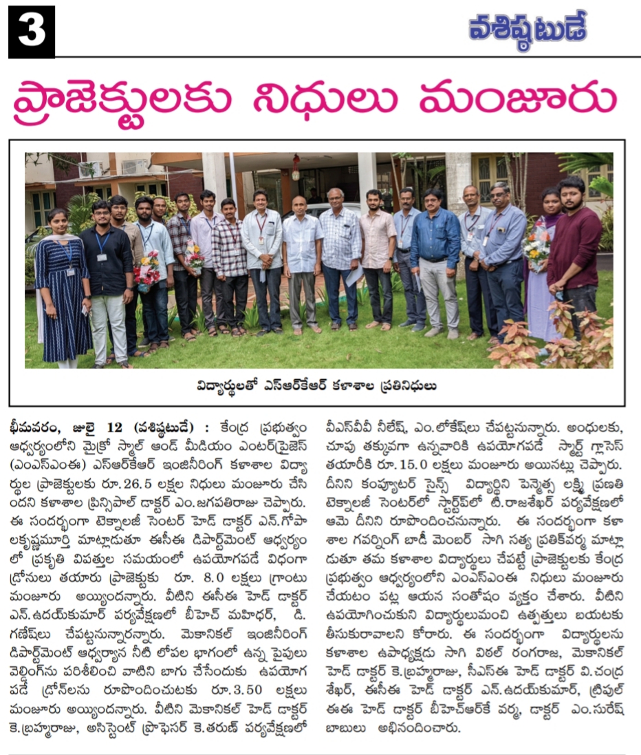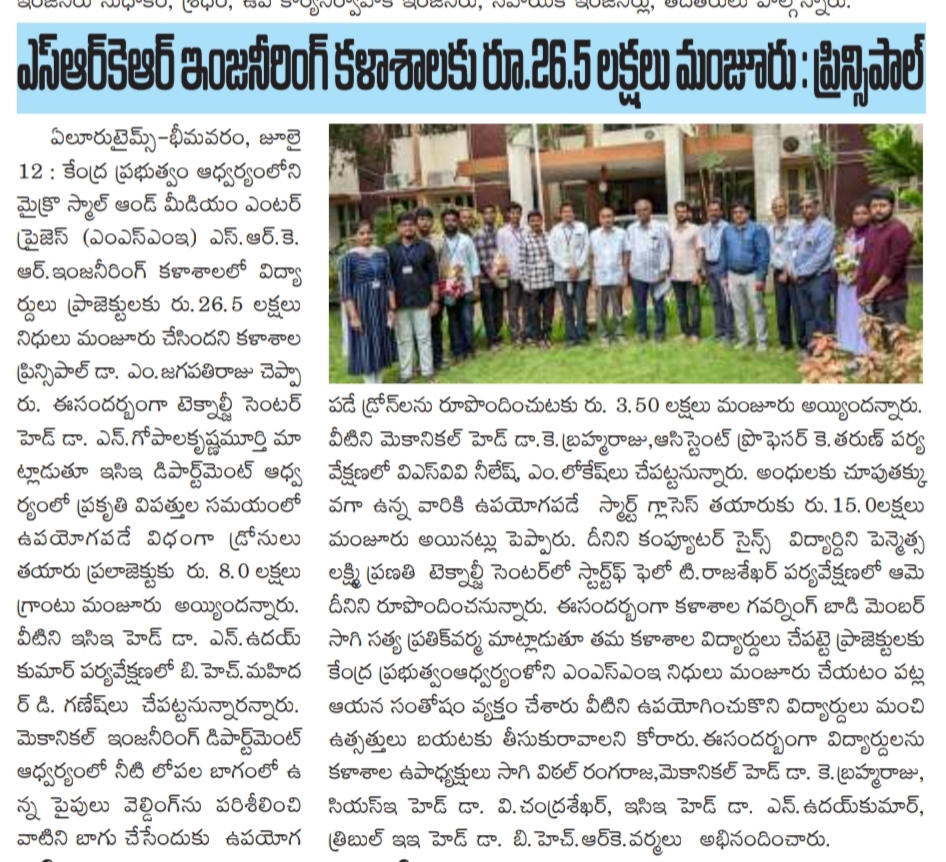 Micro, Small and Medium Enterprises (MSME) of Govt of India had funded Rs.26.5L to the students of SRKR, Principal Dr. M. Jagapathi Raju had said. Revealing the details, Head of the Technology Centre Dr. Gopi had said that Dept of ECE had got a funding of 8L for Drones which will be used during natural calamities. Dept of Mechanical Engineering got a funding of 3.5L for the drones which will be used to repair the pipes underground. Smart glasses for the partially blind and complete blind people got a funding of 15L. Governing Body Member Mr. Pratik Varma had expressed his happiness about this achievement and urged the students to bring out state of the art products. The entire team who got the funding were felicitated by the college vice president Sri. SV Ranga Raju along with the HODs of CSE, ECE, EEE and Mechanical Departments.